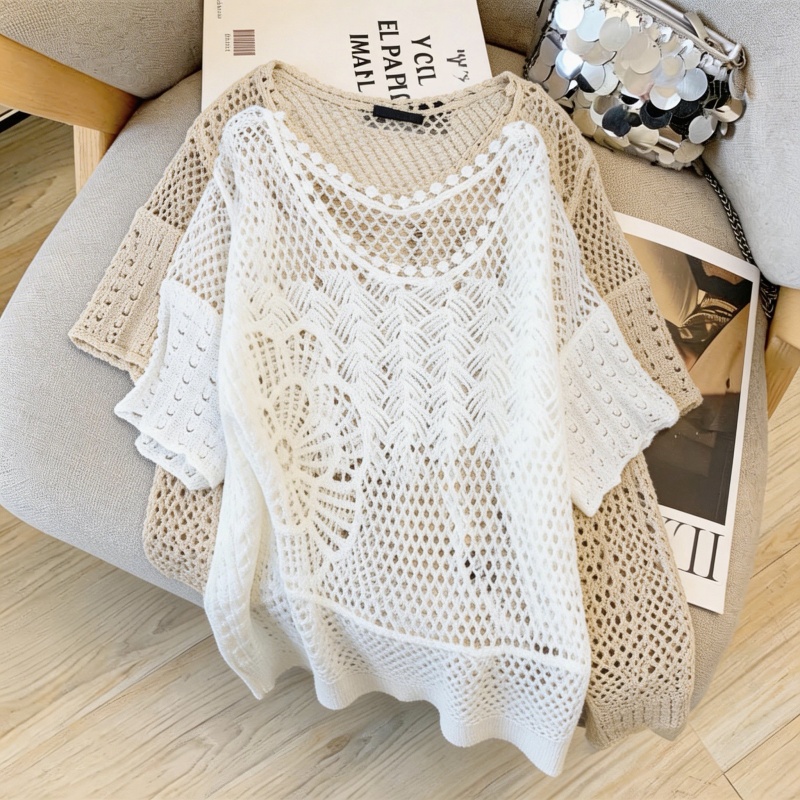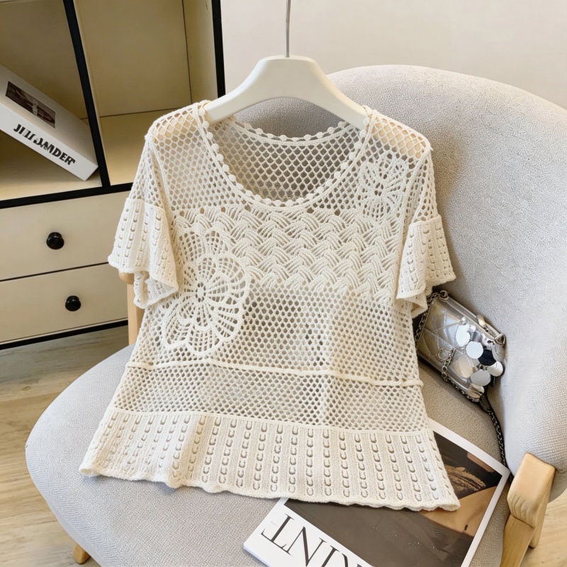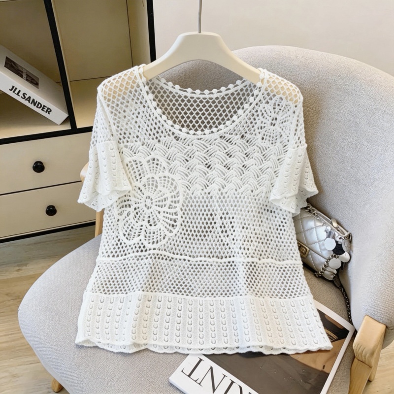 小清新圆领钩花镂空针织衫女夏荷叶边短袖宽松透气上衣 服裝批發女裝批發服飾貨源