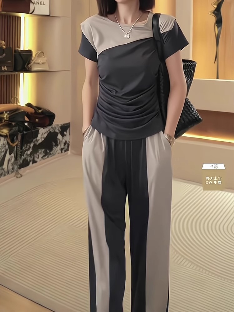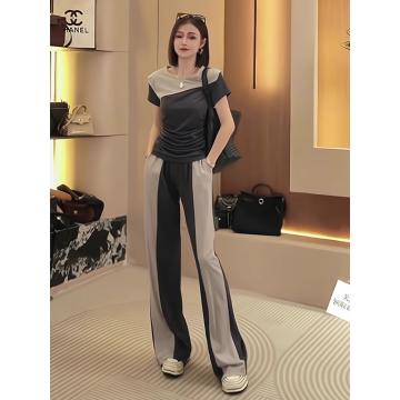 职业通勤百搭套装夏季新款休闲时尚拼色短袖T恤阔腿裤两件套 服裝批發女裝批發服飾貨源