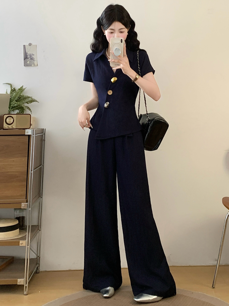 BY17508# 高级感套装老钱风胖mm夏季新款设计感上衣+遮肉阔腿裤两件套 服裝批發女裝批發服飾貨源