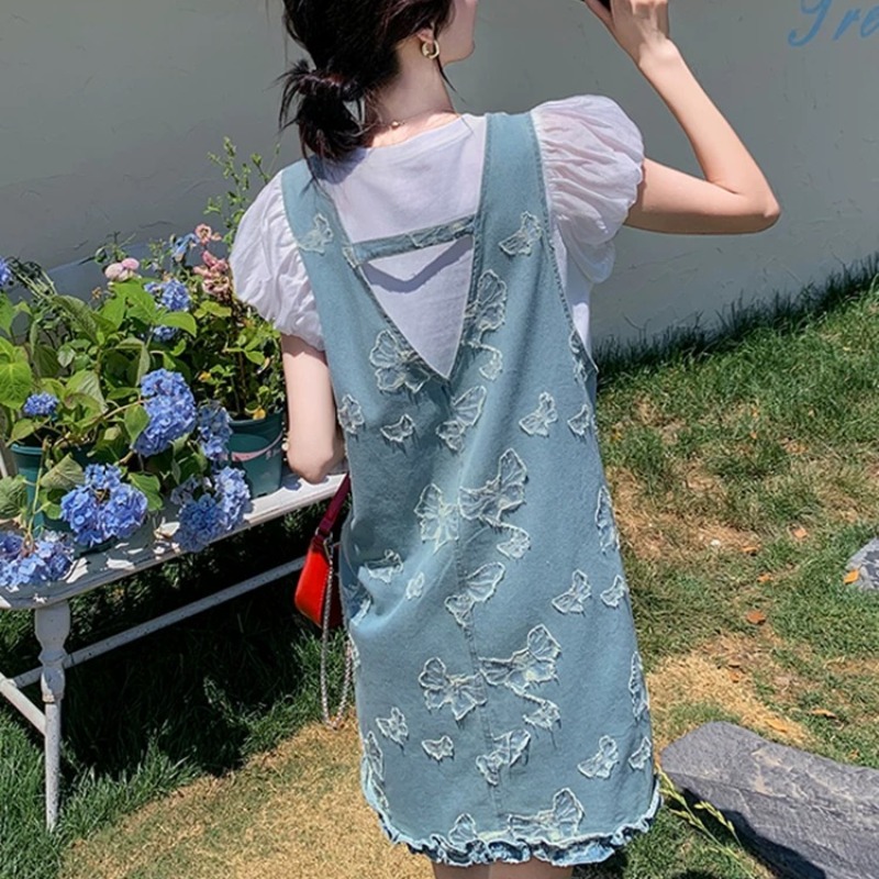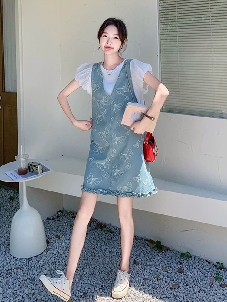 BY17540# 牛仔背带连衣裙女夏新款小个子俏皮活泼减龄绝美短裙两件套装 服裝批發女裝批發服飾貨源