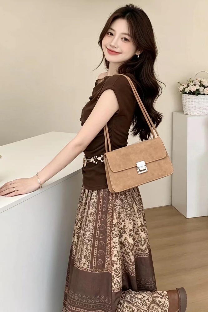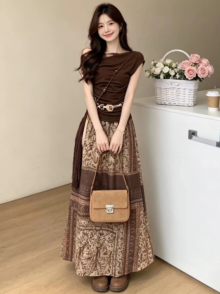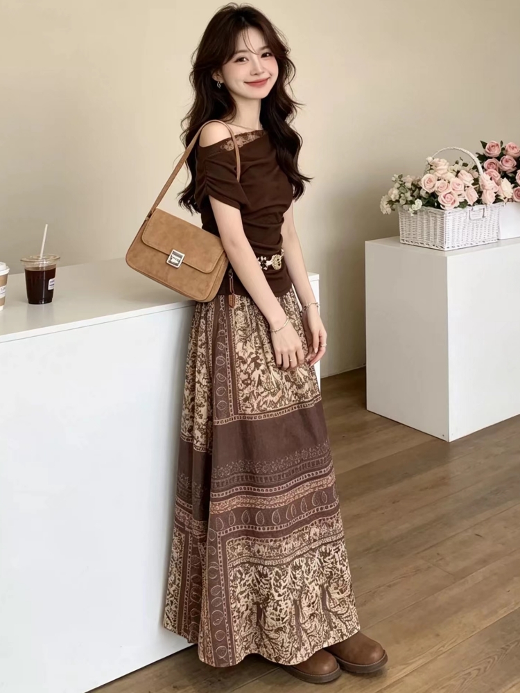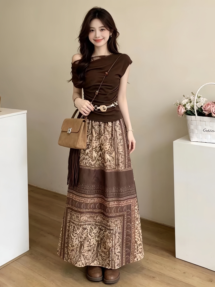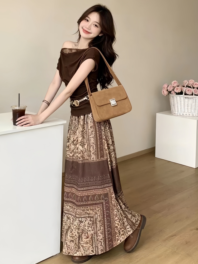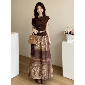BY17679# 波西米亚风套装女夏季新款斜肩收腰短袖T恤复古印花半身裙两件套 服裝批發女裝批發服飾貨源