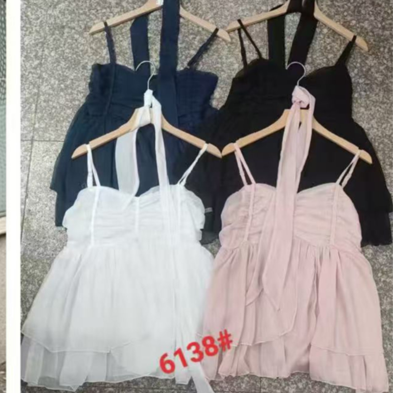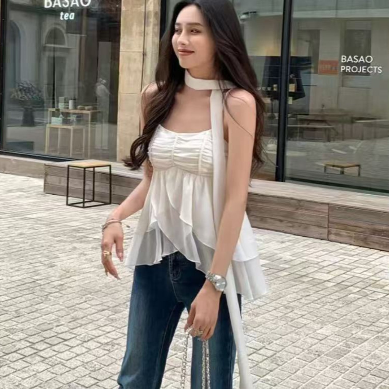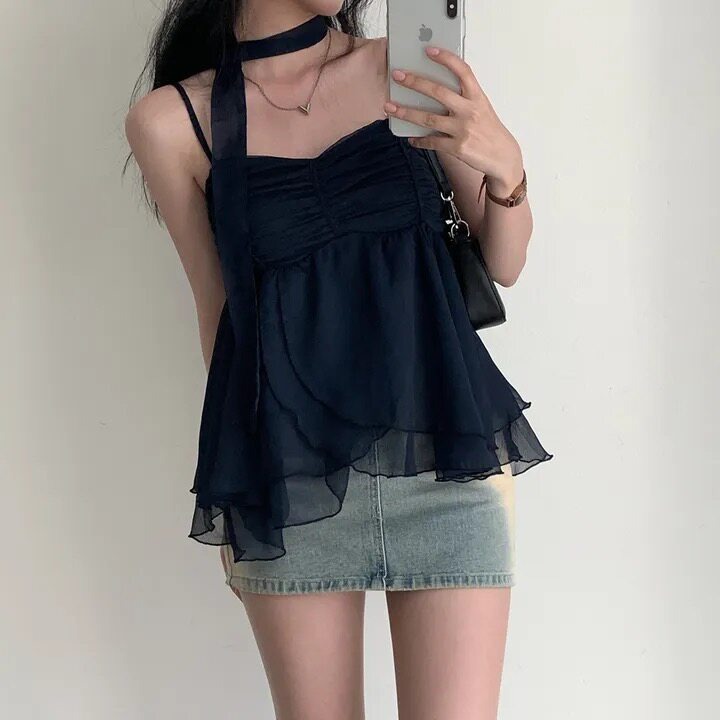 法式雪纺背心吊带女夏季藏蓝色褶皱修身百搭气质带小围巾上衣 服裝批發女裝批發服飾貨源