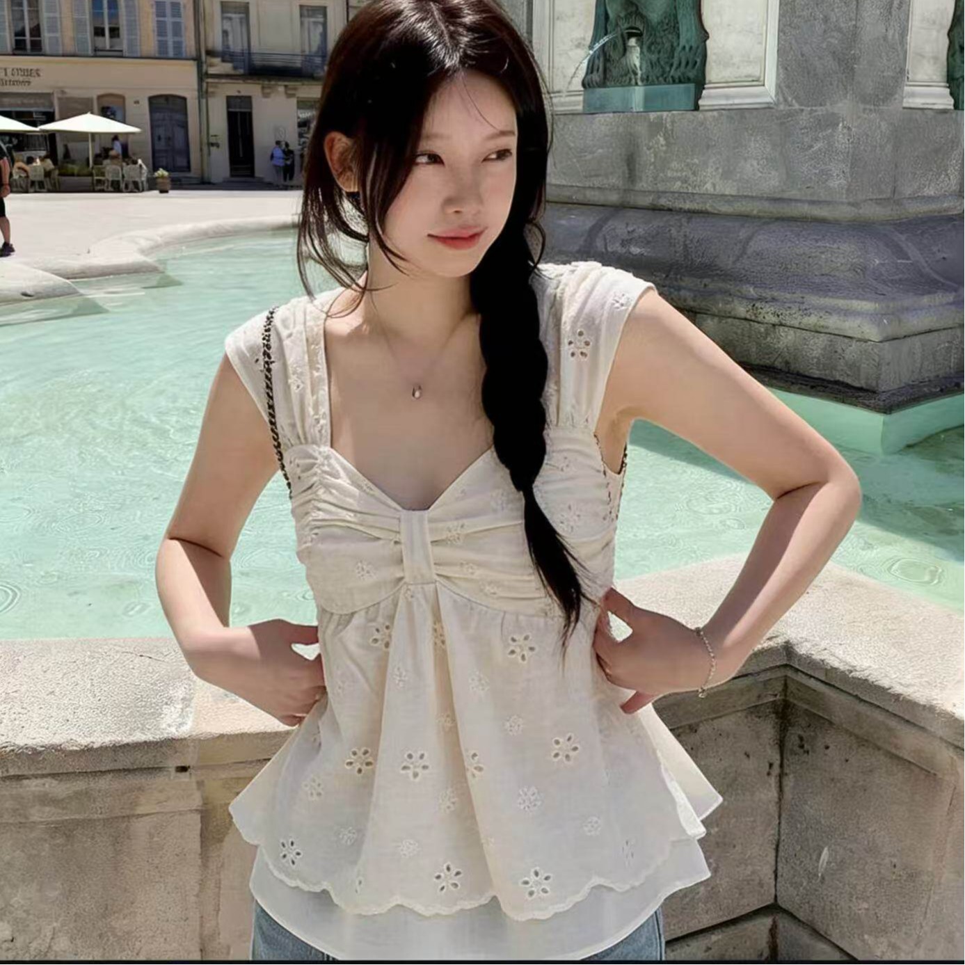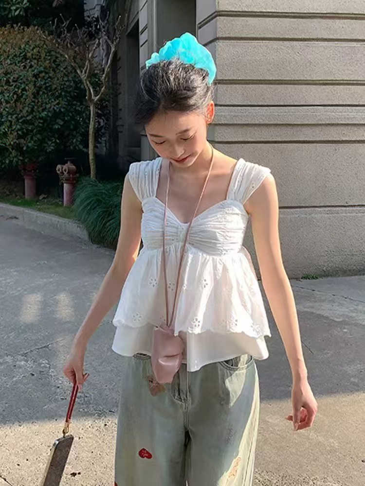 法式镂空刺绣吊带背心女新款温柔风V领收腰显瘦无袖上衣 服裝批發女裝批發服飾貨源