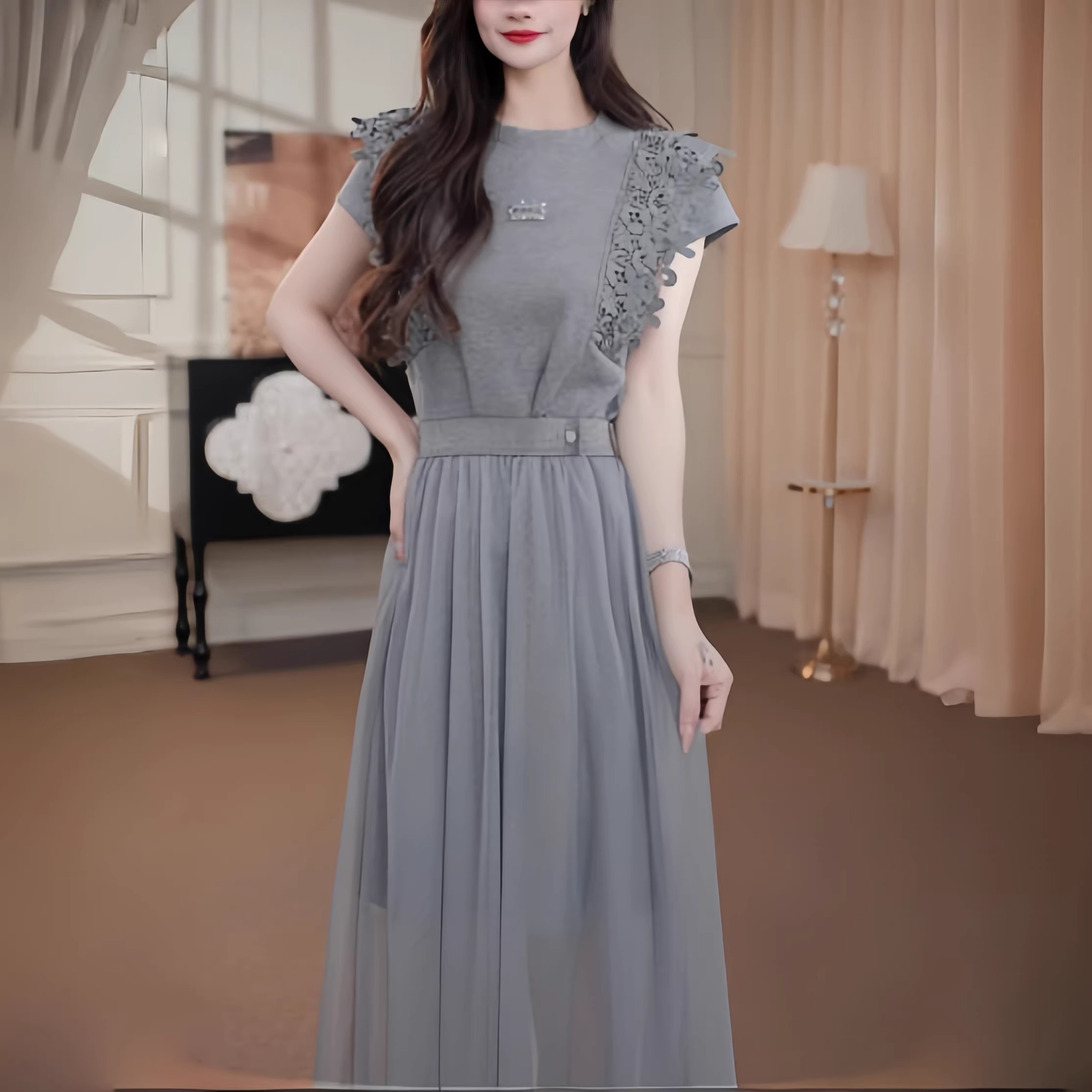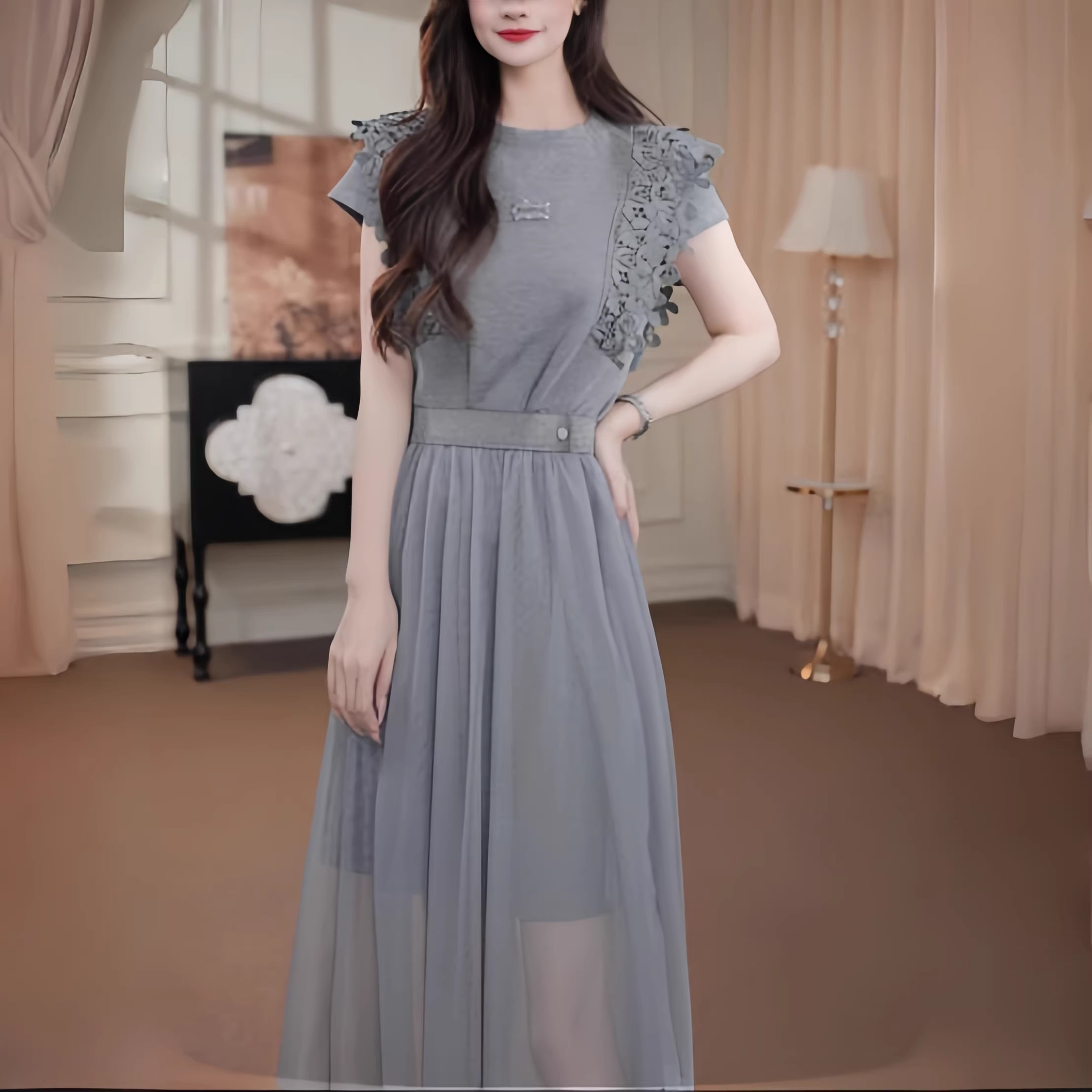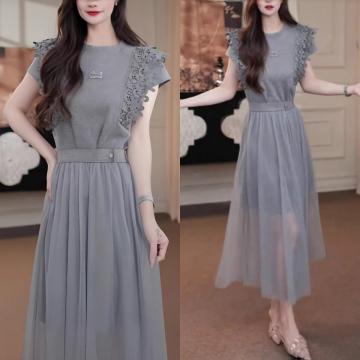 BY17825# 时尚法式短袖连衣裙夏季新款气质收腰显瘦纱网拼接休闲裙子两件套 服裝批發女裝批發服飾貨源
