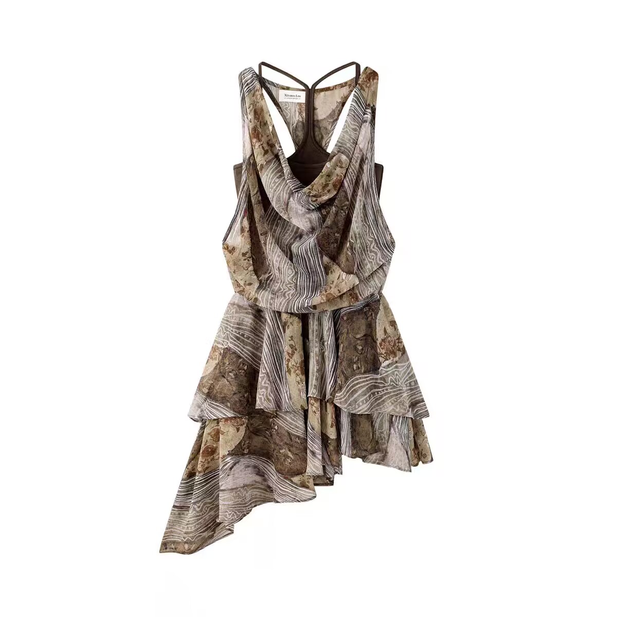 BY17830# 小众设计感挂脖荡领收腰修身连衣裙女飘逸不规则裙摆度假风短裙 服裝批發女裝批發服飾貨源