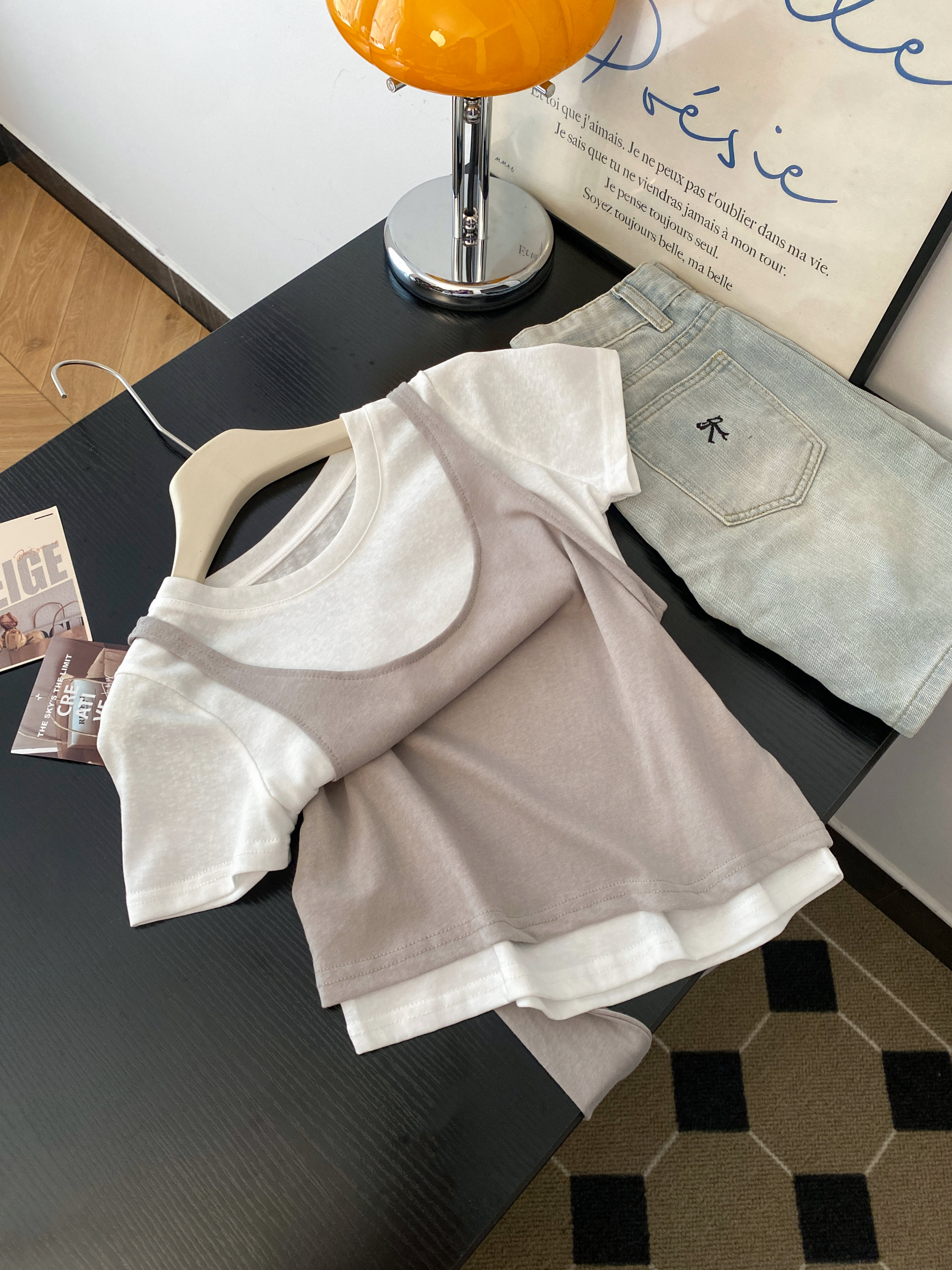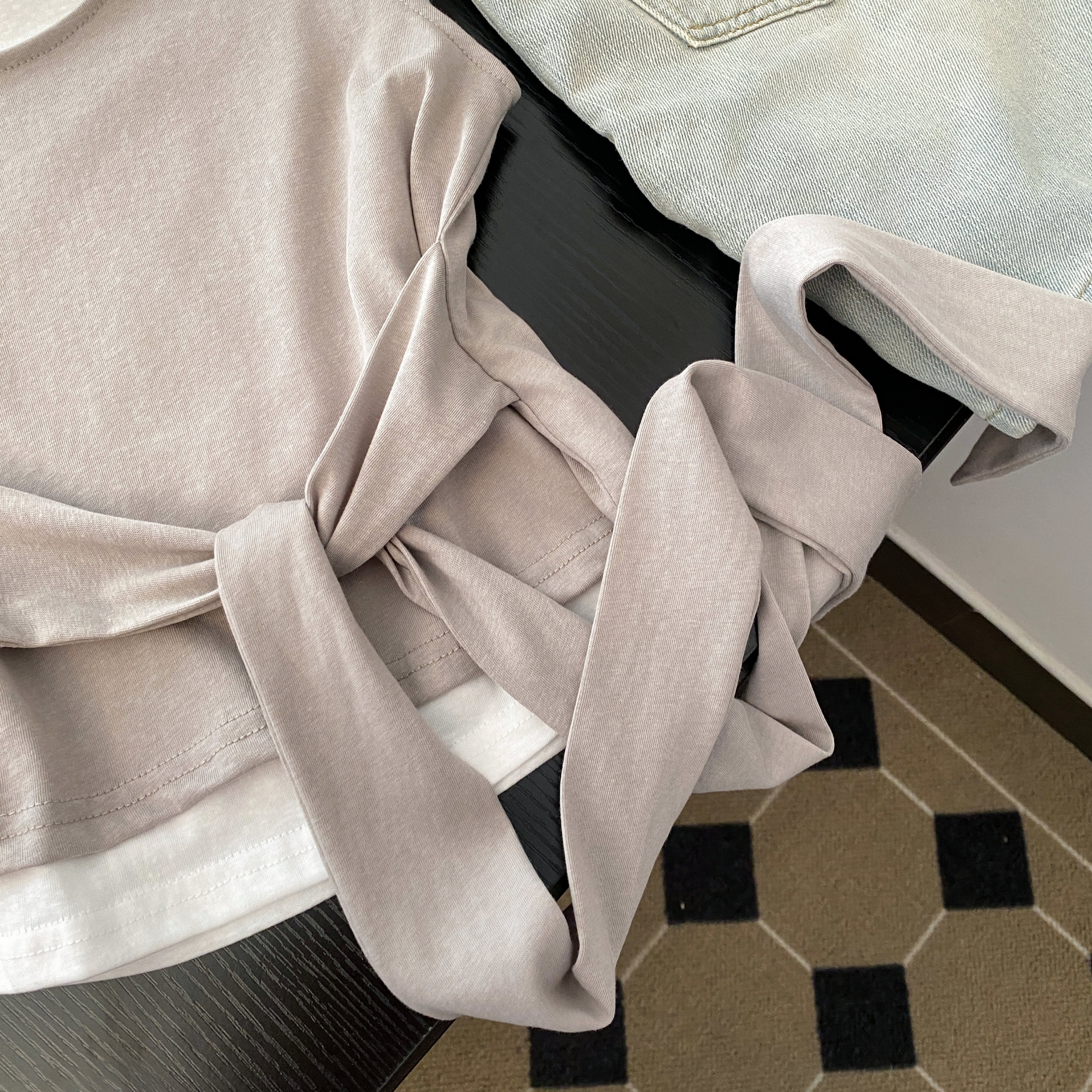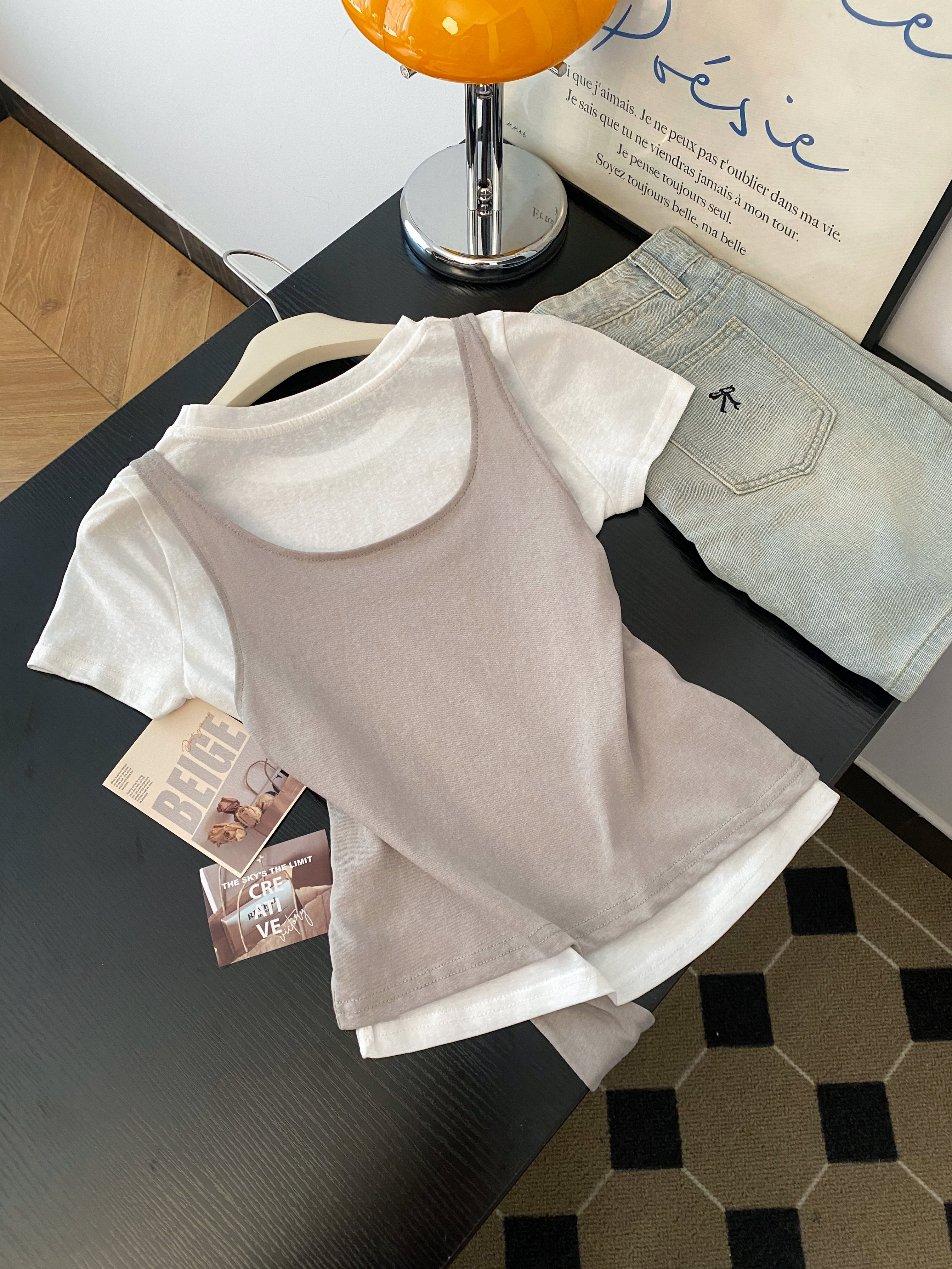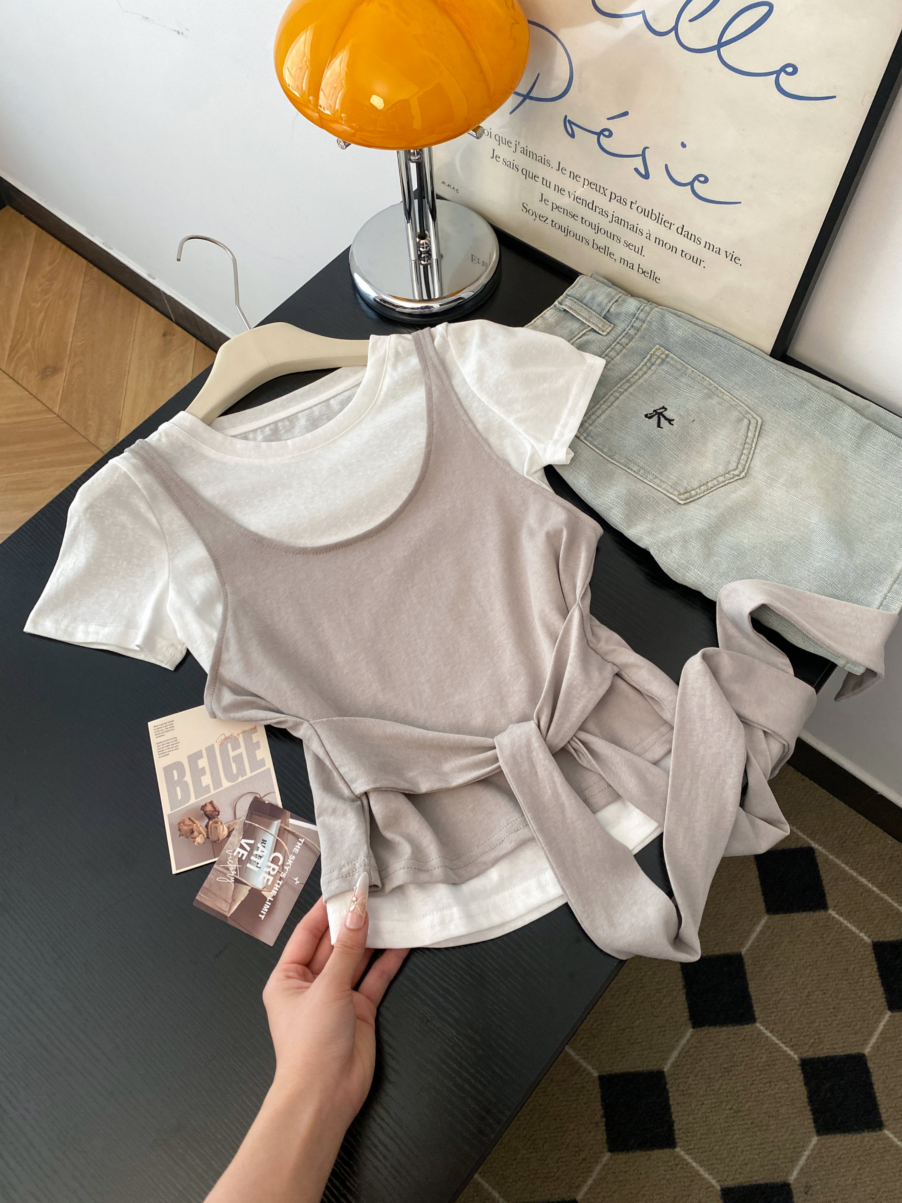 FA32026# 韩系撞色真两件正肩系带短袖t恤女夏季别致短款修身亚麻上衣 服裝批發女裝批發服飾貨源