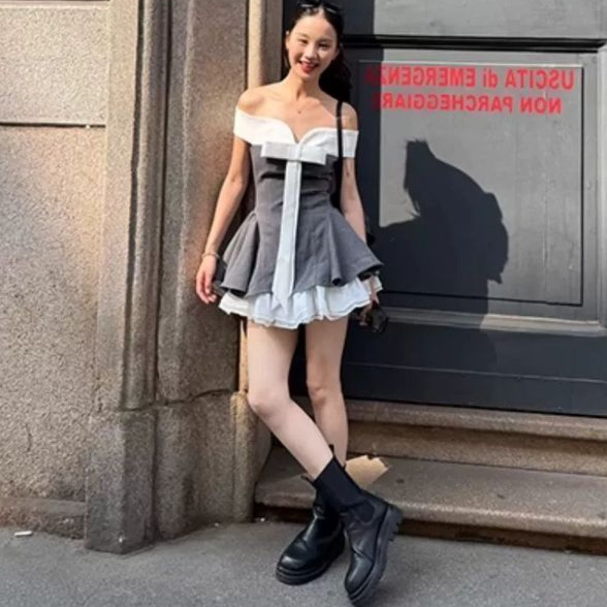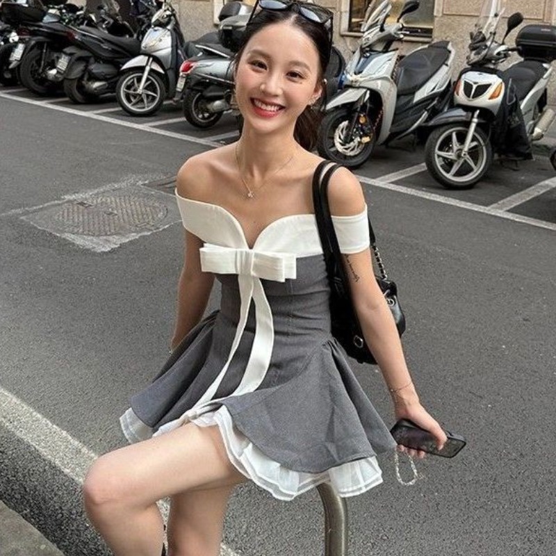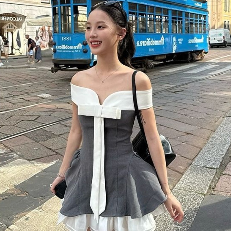 FA34201# 千金芭蕾风蝴蝶结撞色拼接一字肩抹胸连衣裙女夏季新款潮ins裙子 服裝批發女裝批發服飾貨源