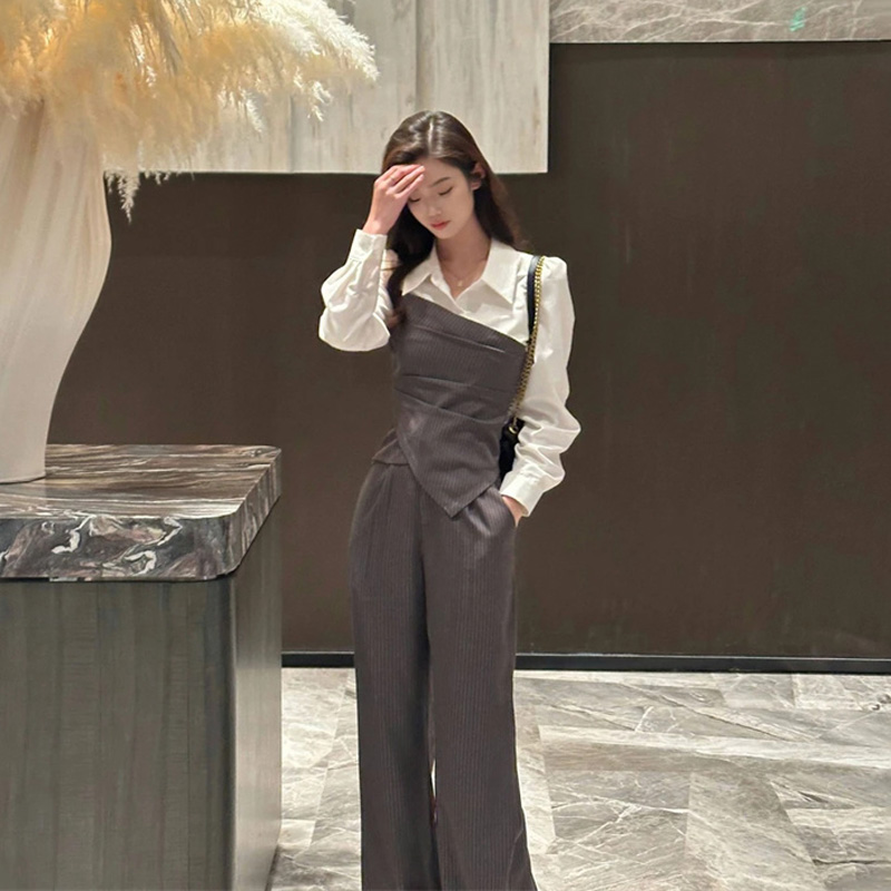 FA39545# 新款秋季气质优雅高腰显瘦假两件长袖上衣+裤子套装 服裝批發女裝批發服飾貨源