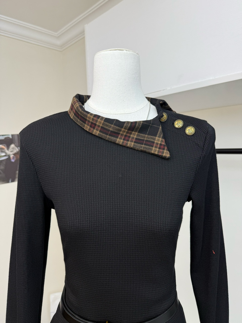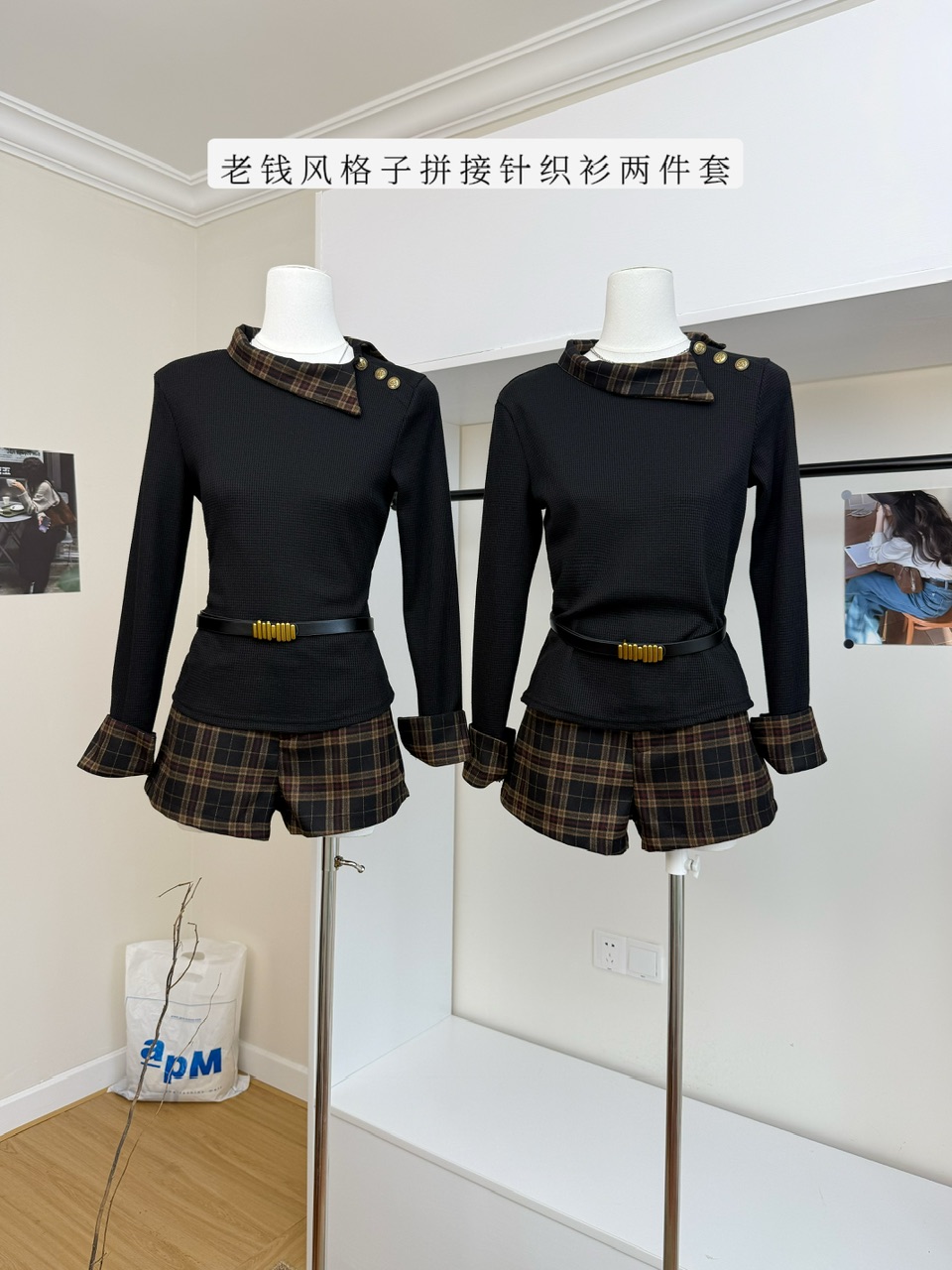 FA44872# 格子拼接长袖针织衫女秋vintage老钱风上衣假两件套 服裝批發女裝批發服飾貨源