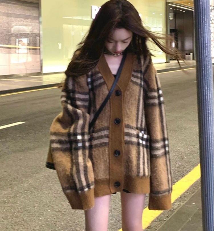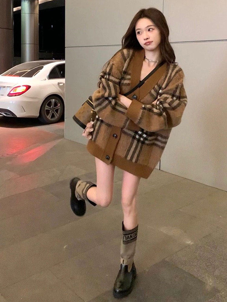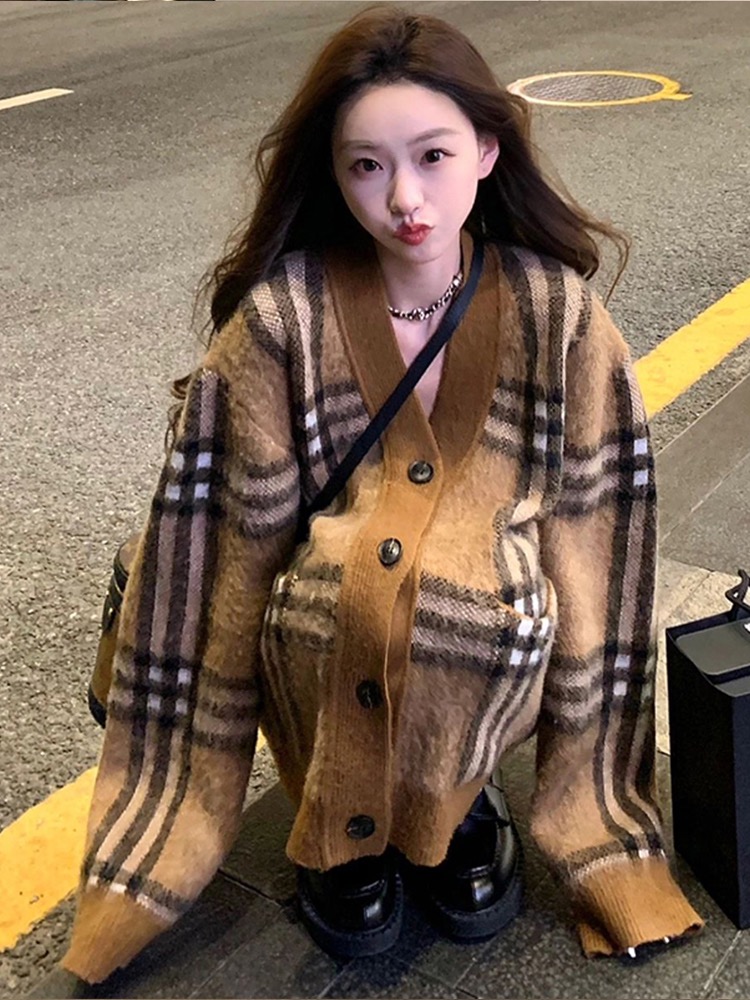 FA44882# 冬装新款大板型大码女装格子撞色宽松慵懒风格纹毛衣外套针织开衫 服裝批發女裝批發服飾貨源