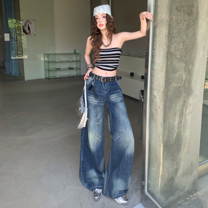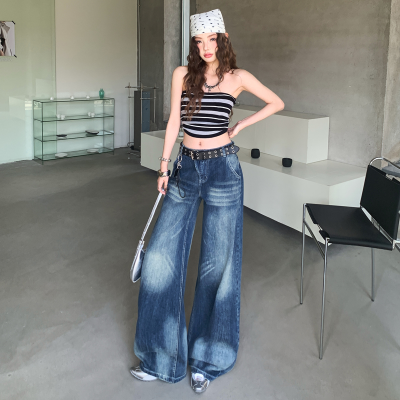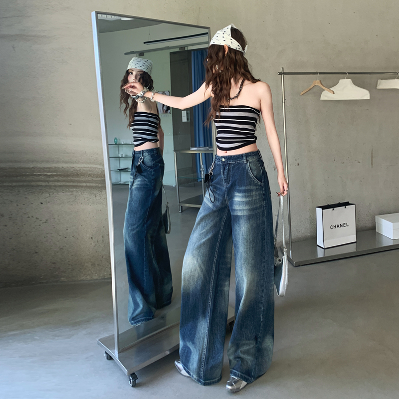 FA52026# 美式深蓝色阔腿牛仔裤女春装新款宽松垂感直筒拖地裤子 服裝批發女裝批發服飾貨源