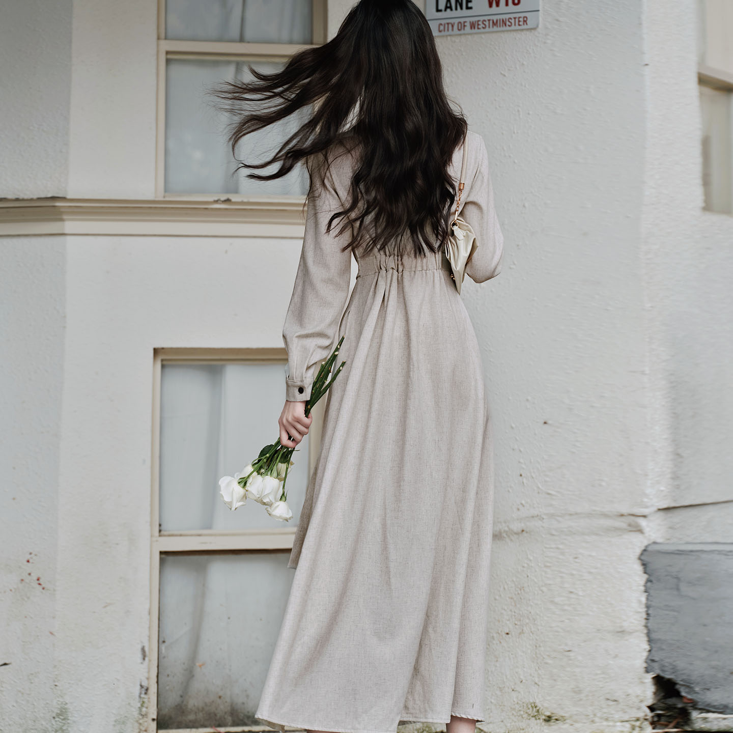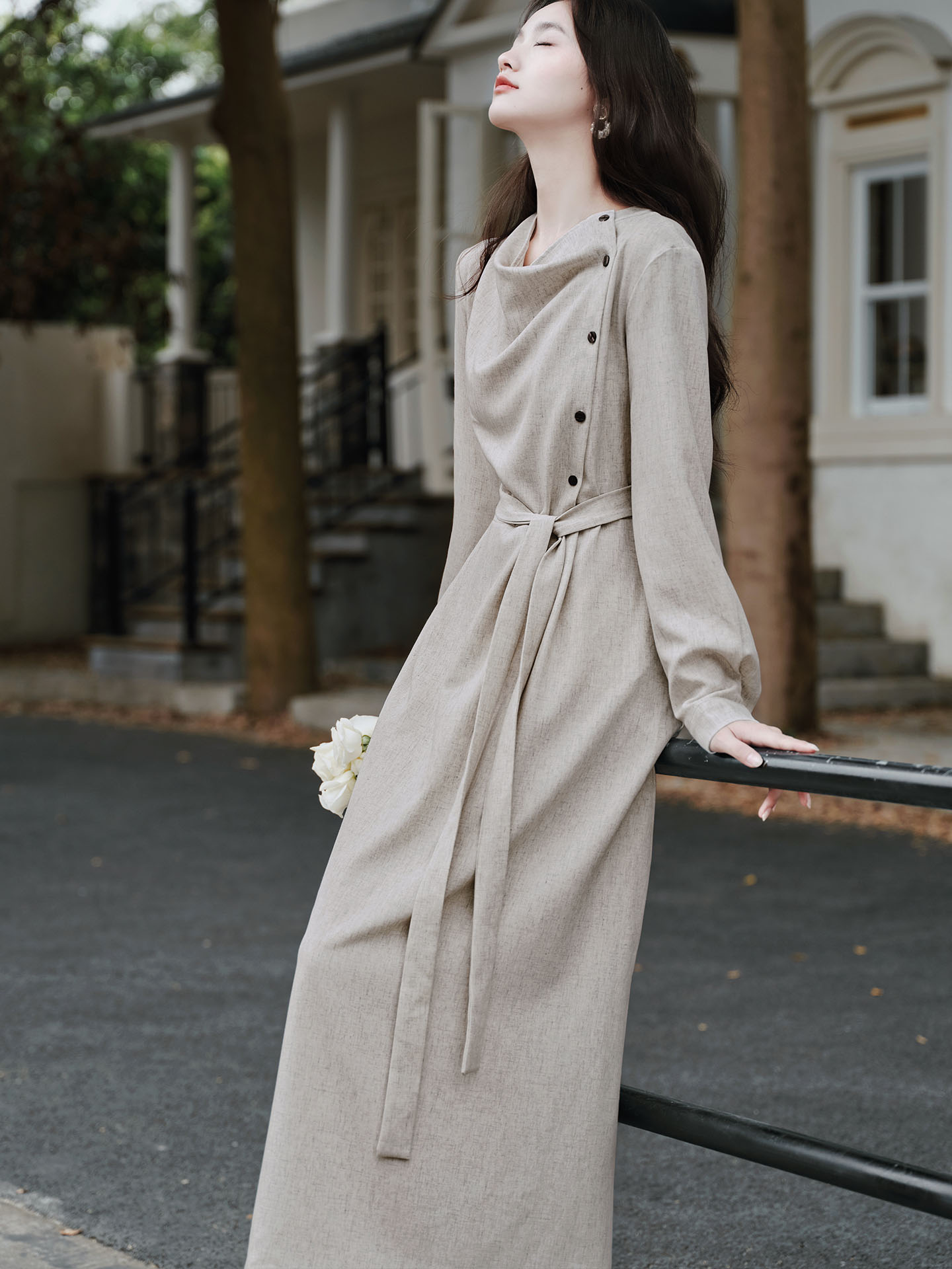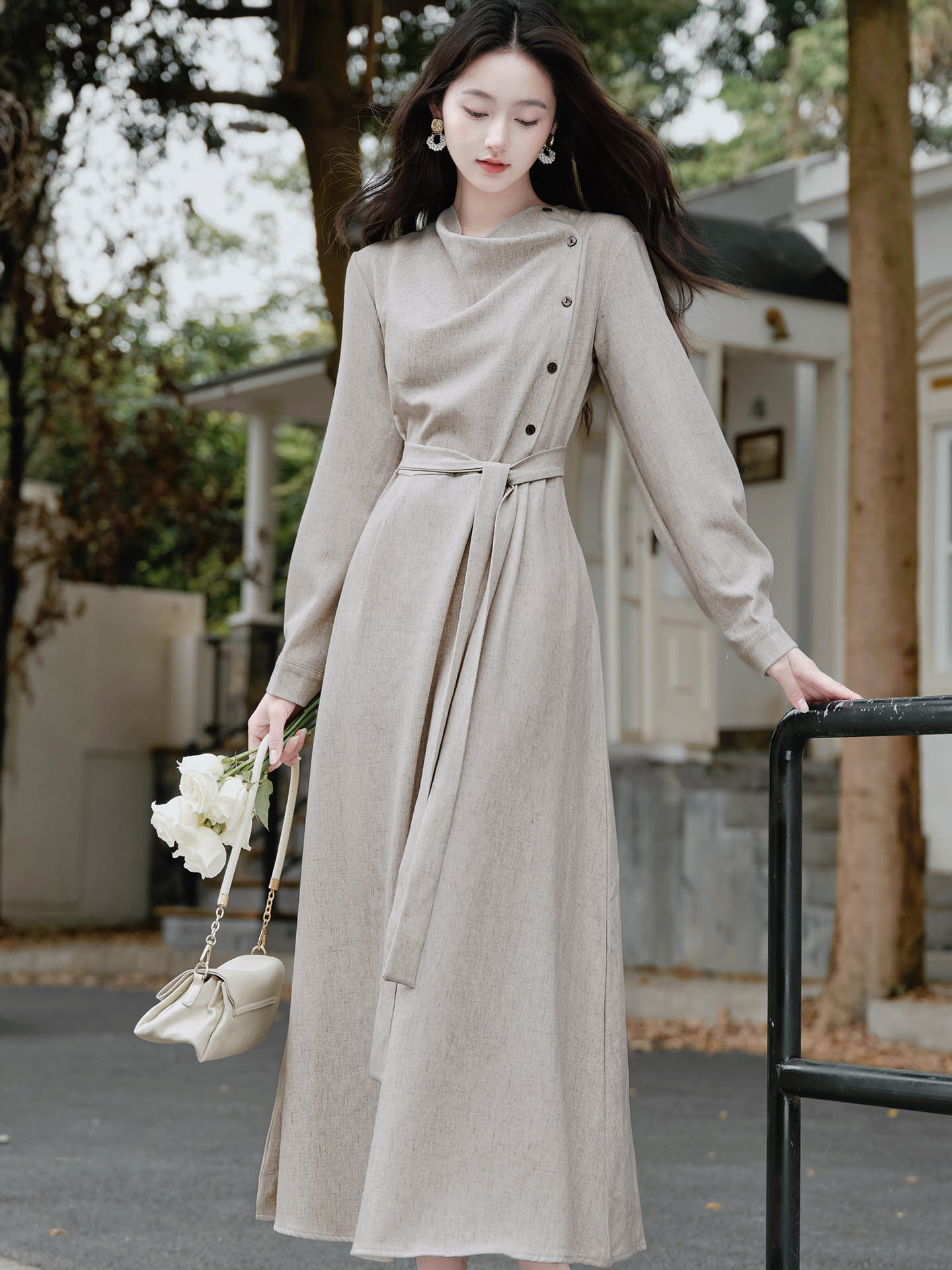 FA52083# 贰羊设计暮云归高级感长袖斜门襟连衣裙女秋知识分子风收腰裙 服裝批發女裝批發服飾貨源