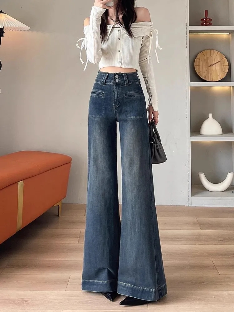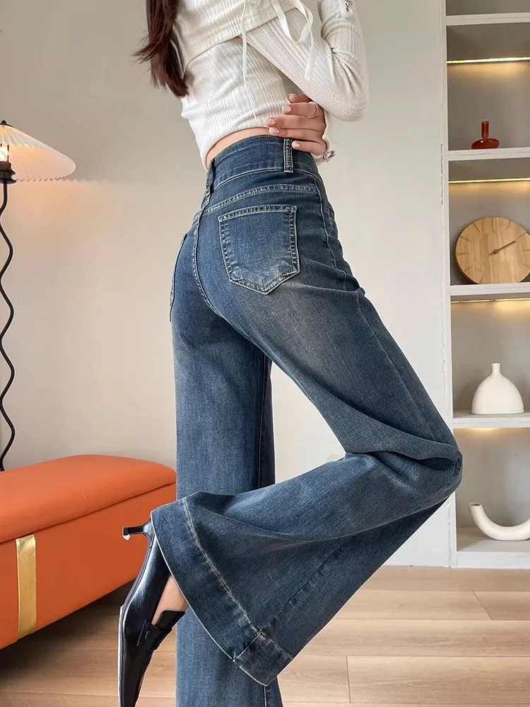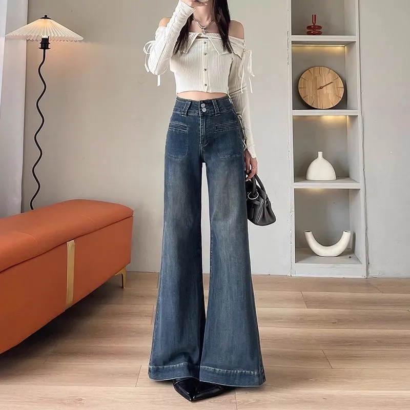 FA52087# 韩版复古高腰阔腿牛仔裤女春季新款宽松显瘦直筒喇叭拖地裤 服裝批發女裝批發服飾貨源