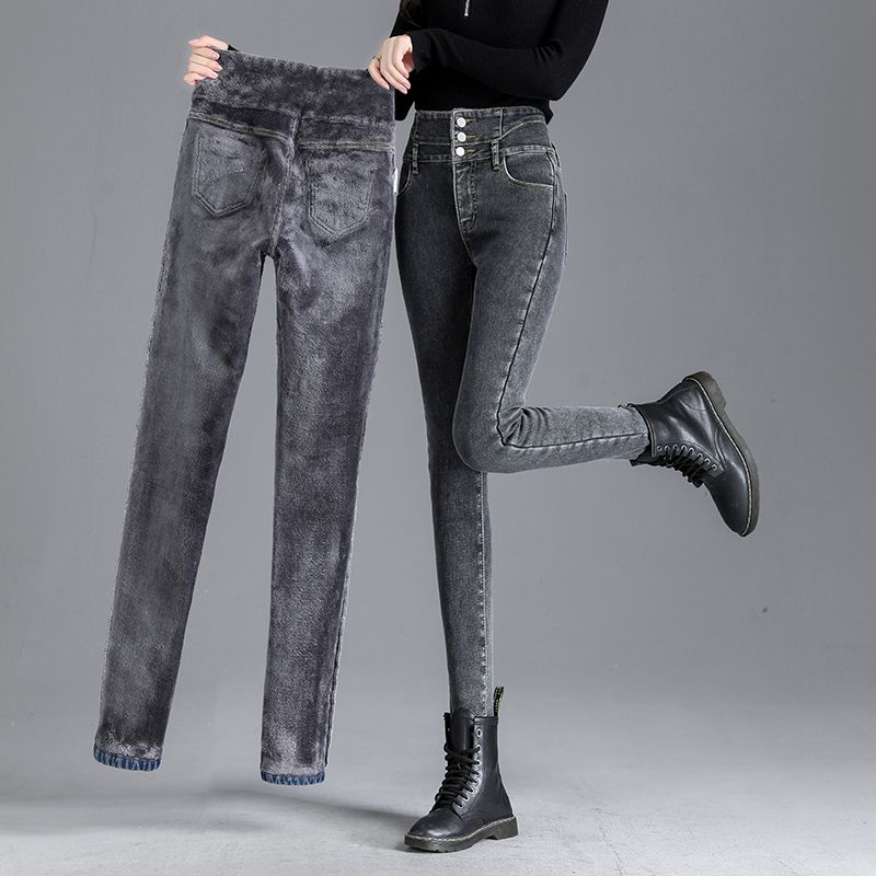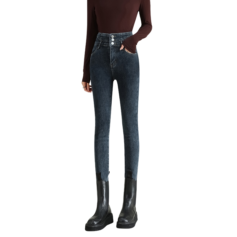 FA52090# 秋冬加绒高腰弹力多扣小脚牛仔裤女修身提臀显瘦百搭热裤九分长裤 服裝批發女裝批發服飾貨源