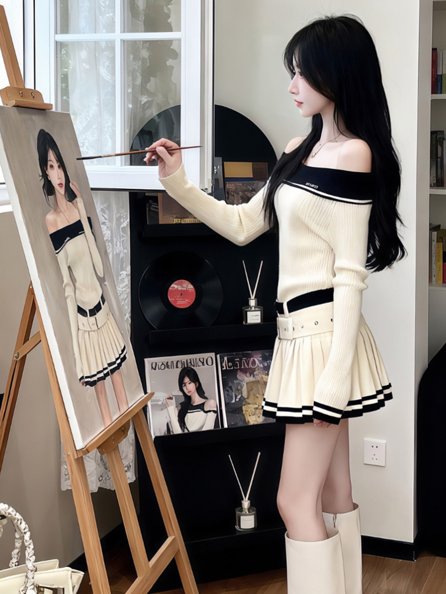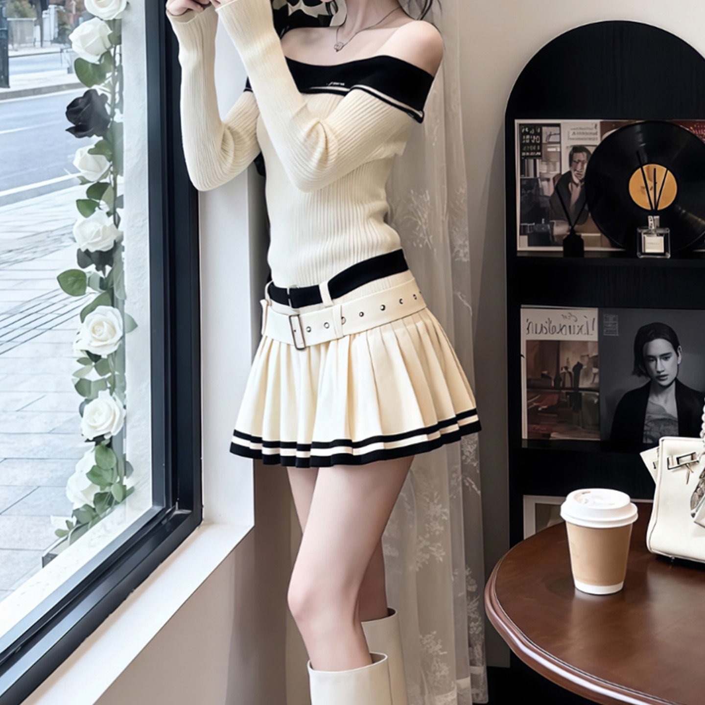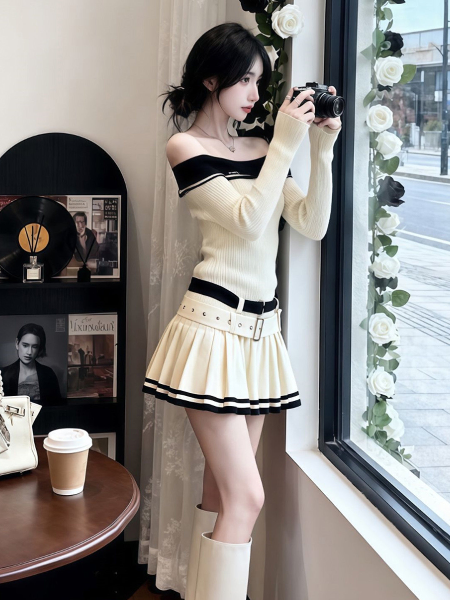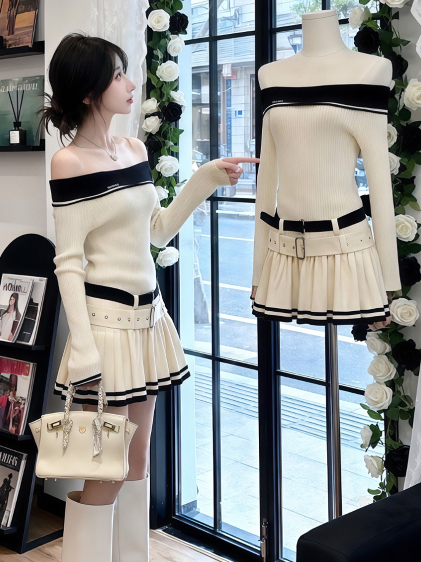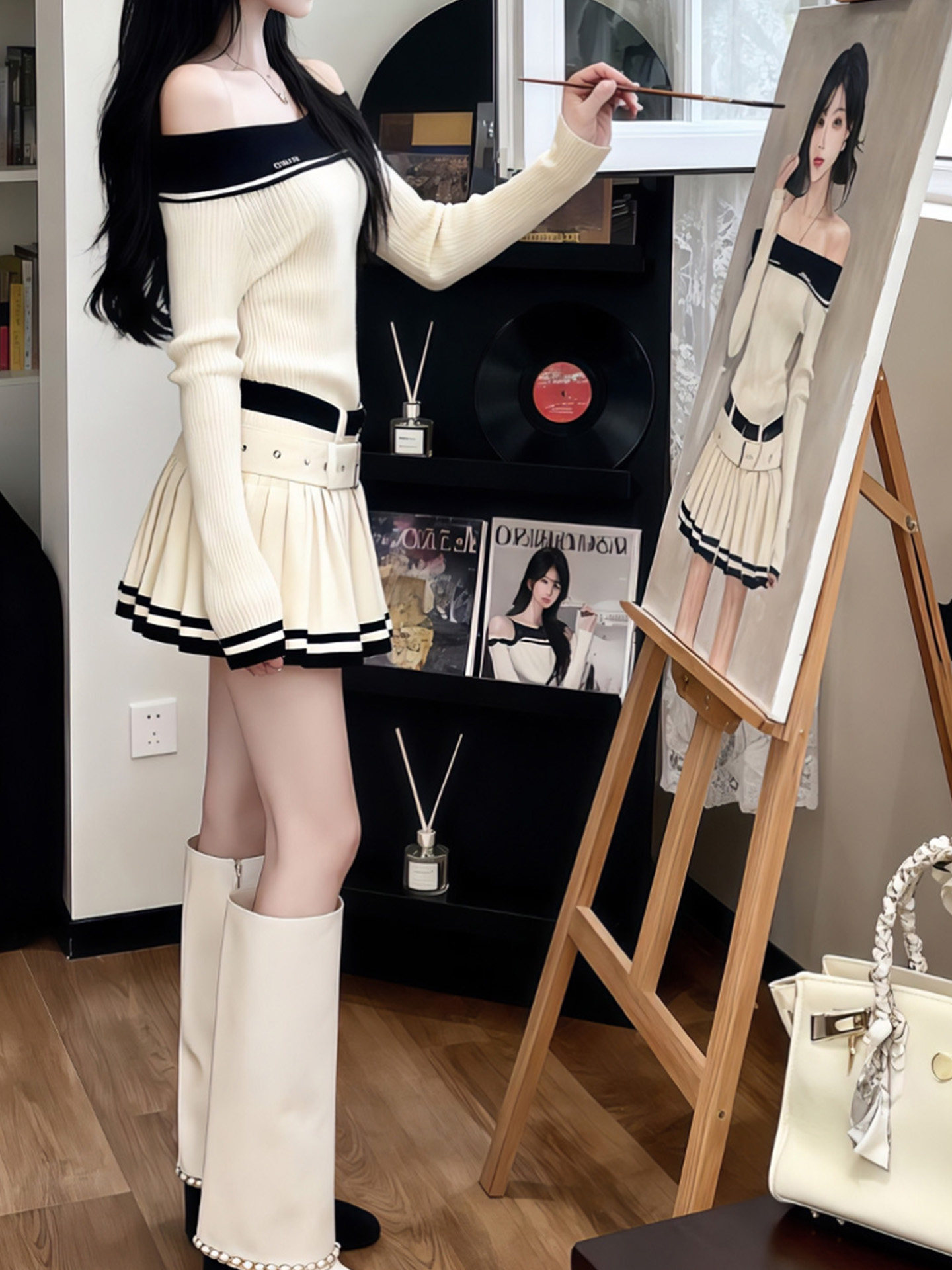 FA52337# 学院风气质甜美撞色一字肩连衣裙秋冬新款辣妹修身针织短裙女配送两条腰带 服裝批發女裝批發服飾貨源