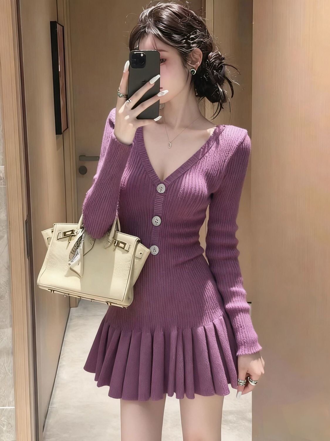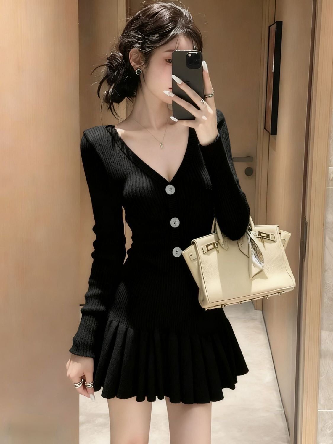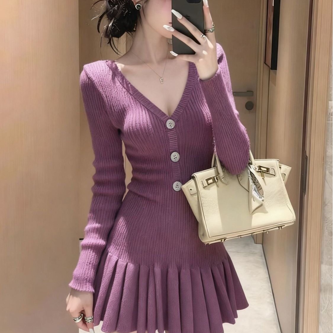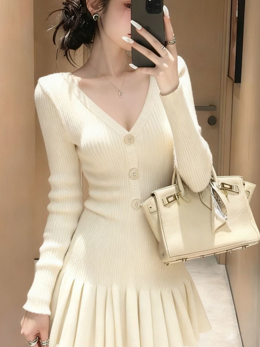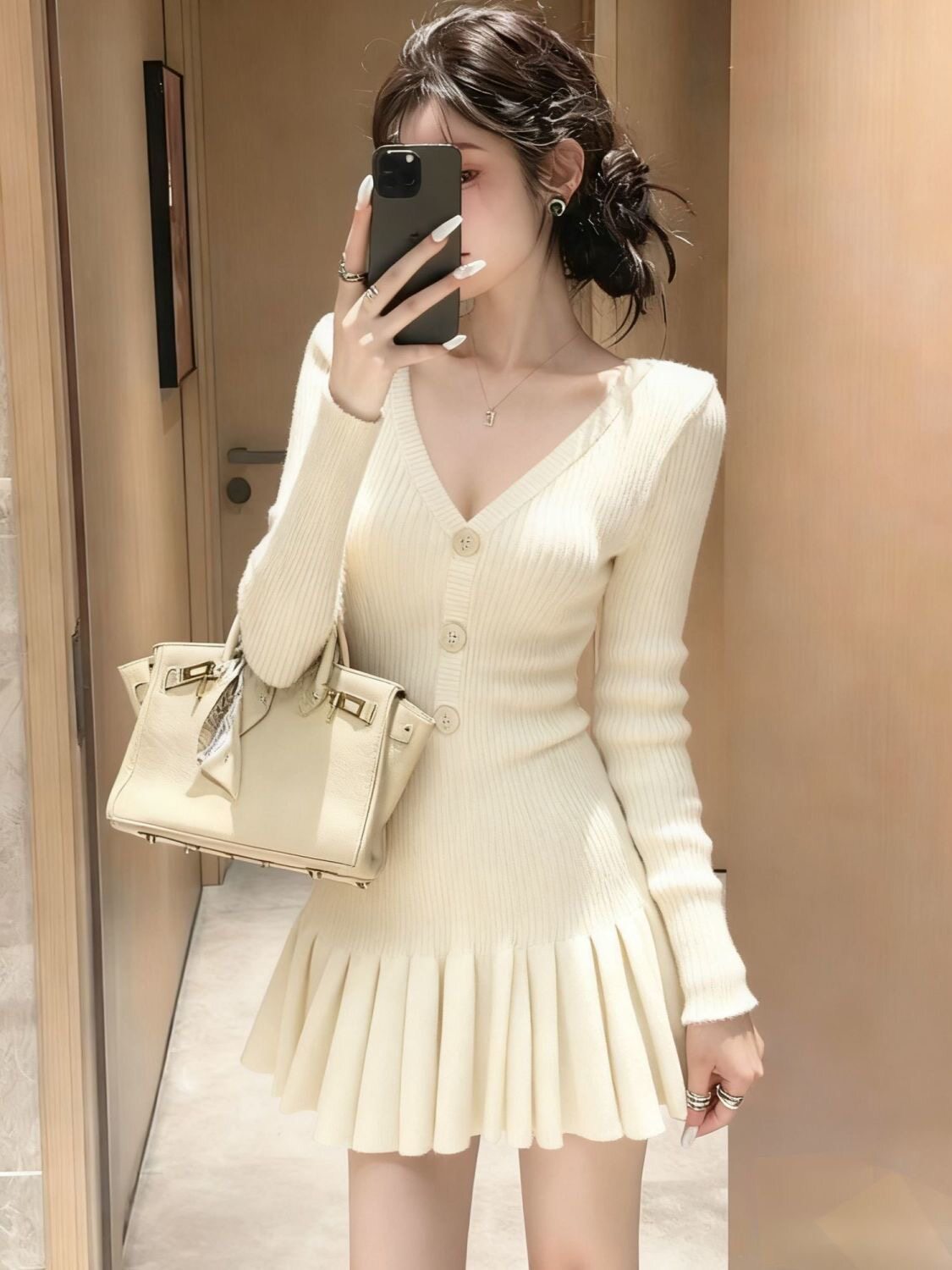 FA52339# 法式v领白色针织连衣裙子女秋冬季新款小个子气质收腰a字短裙 服裝批發女裝批發服飾貨源