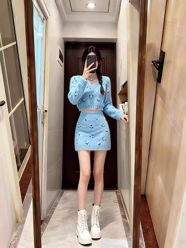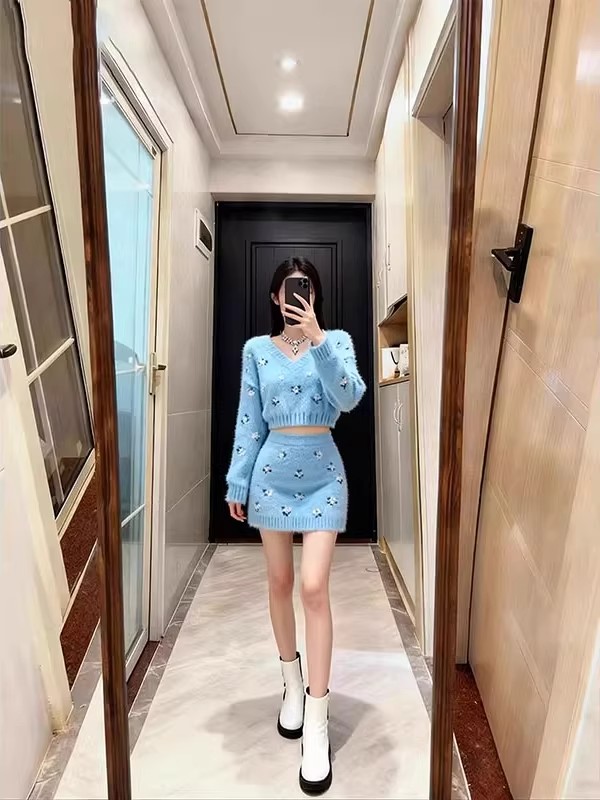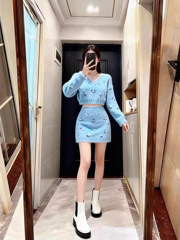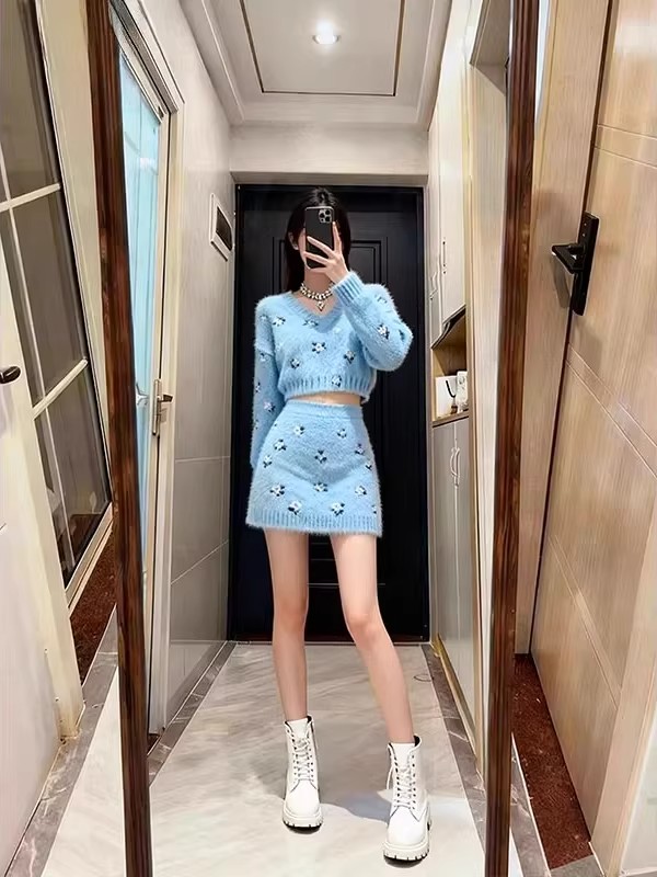 FA52341# 小个子秋冬新款软奶系V领针织套装女高级感显瘦毛衣半身裙两件套 服裝批發女裝批發服飾貨源