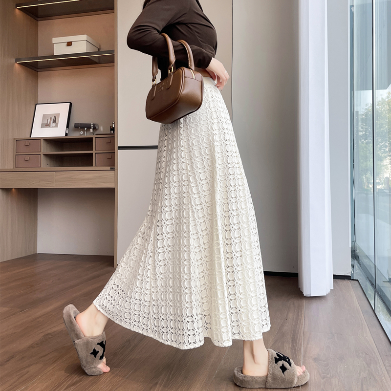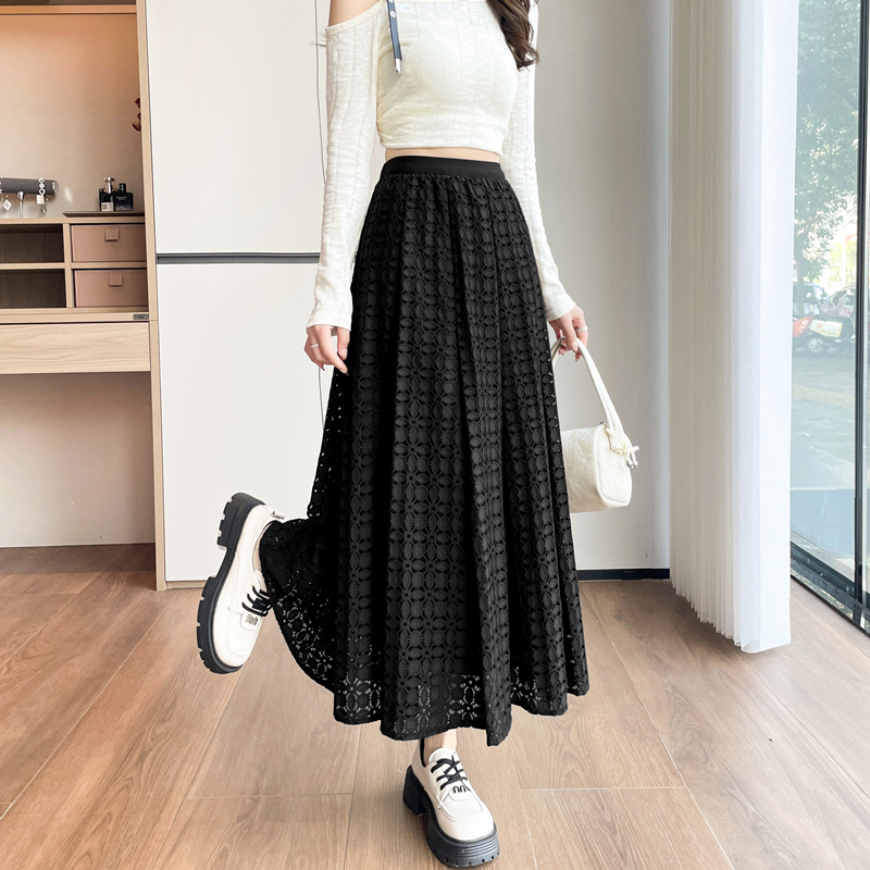FA52556# 新款加厚高腰蕾丝拼接丝绒中长款a字松紧腰大摆遮胯伞裙 服裝批發女裝批發服飾貨源