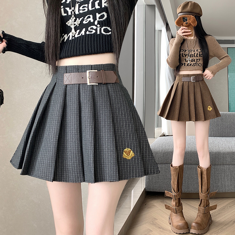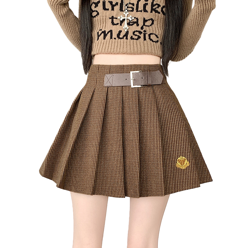 FA52559# 秋冬格纹刺绣设计感百褶裙裤女小个子复古高腰显瘦遮半身裙子 服裝批發女裝批發服飾貨源