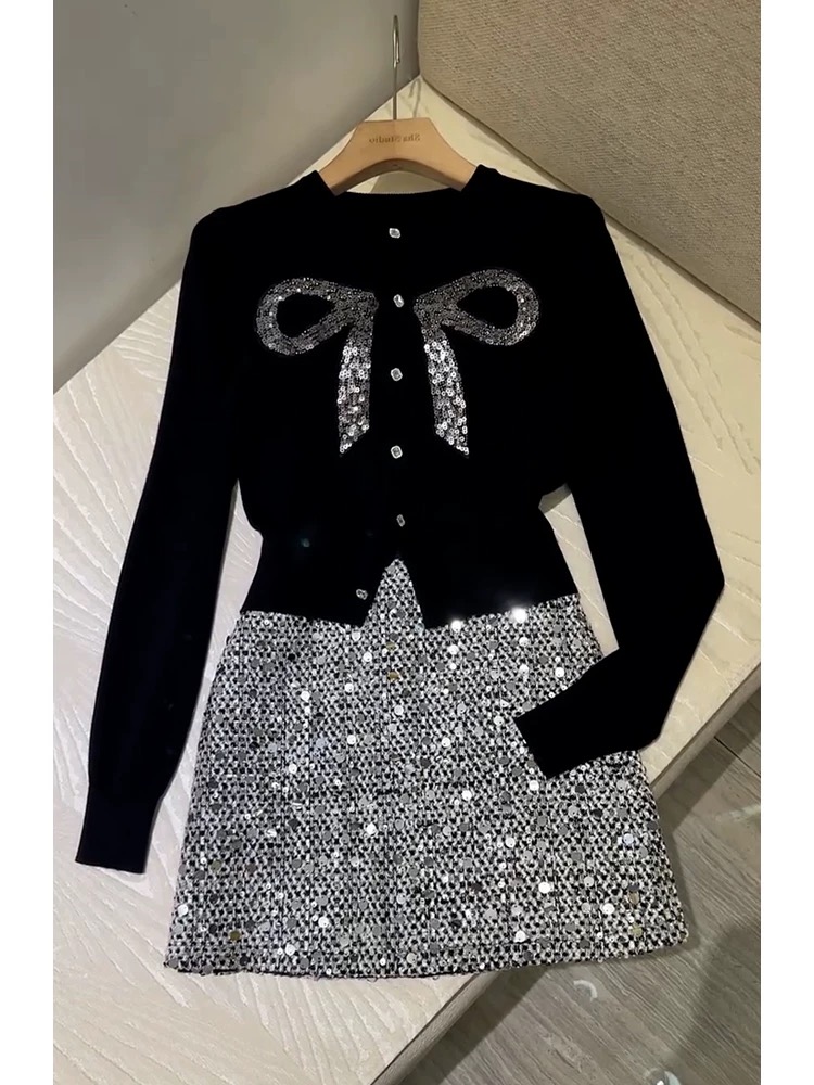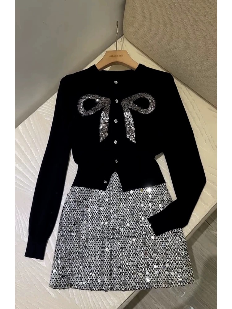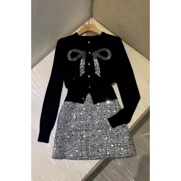 FA52715# 今年流行漂亮洋气减龄高级感黑色蝴蝶结毛衣亮片半身裙套装女冬季 服裝批發女裝批發服飾貨源