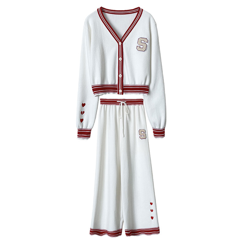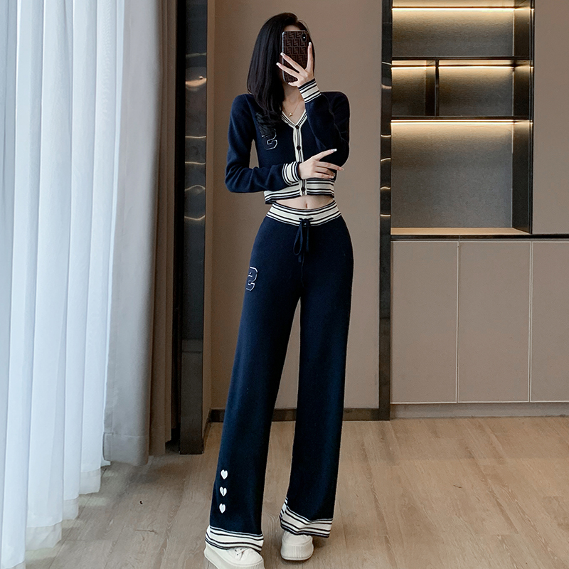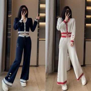 FA52825# 名媛气质小香风辣妹炸街拼色针织套装秋季新款高级感阔腿裤两件套 服裝批發女裝批發服飾貨源