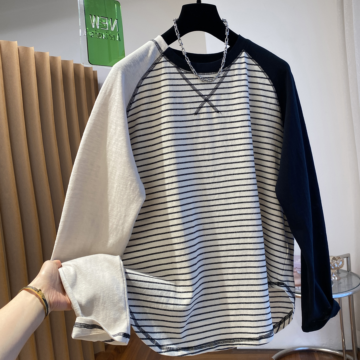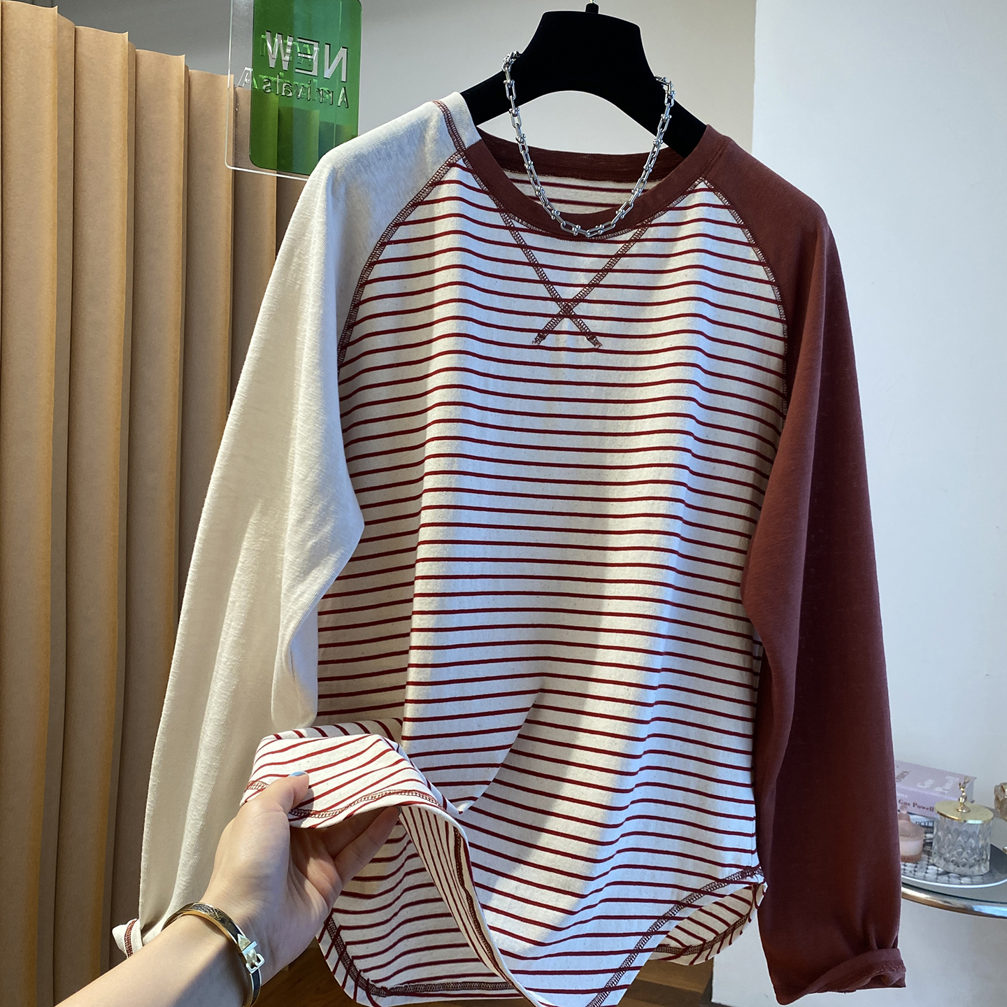 FA52957# 早春韩系高级感条纹t恤女长袖宽松薄款空调衫圆领打底衫上衣 服裝批發女裝批發服飾貨源
