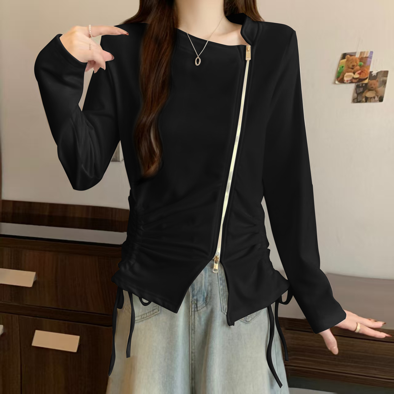 FA53037# ~时尚斜拉链卫衣外套女款抽绳收腰显瘦内搭上衣 服裝批發女裝批發服飾貨源