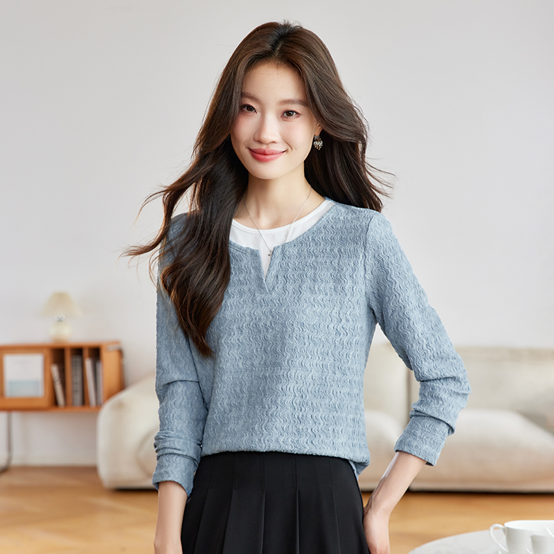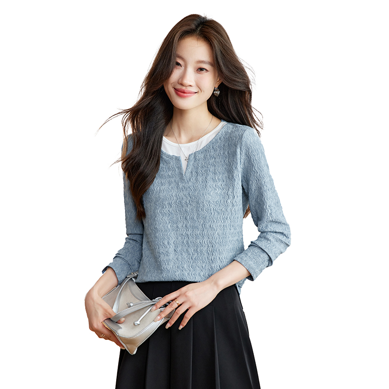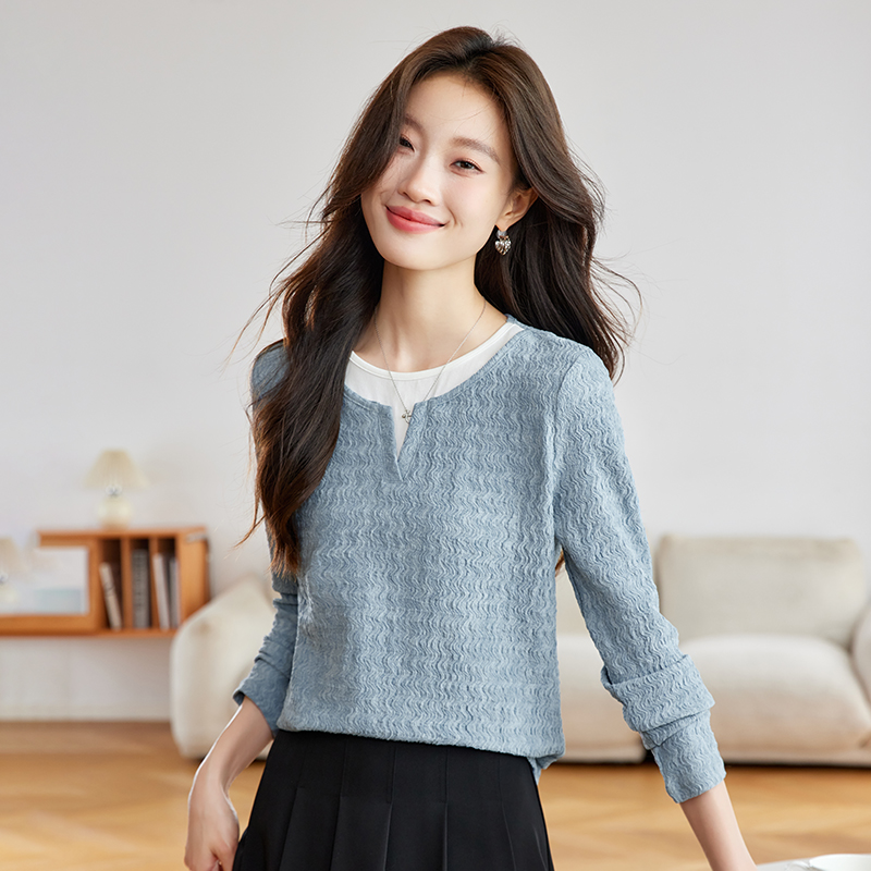 FA53041# 质感拼接长袖春季新款休闲圆领撞色波浪肌理上衣T恤 服裝批發女裝批發服飾貨源
