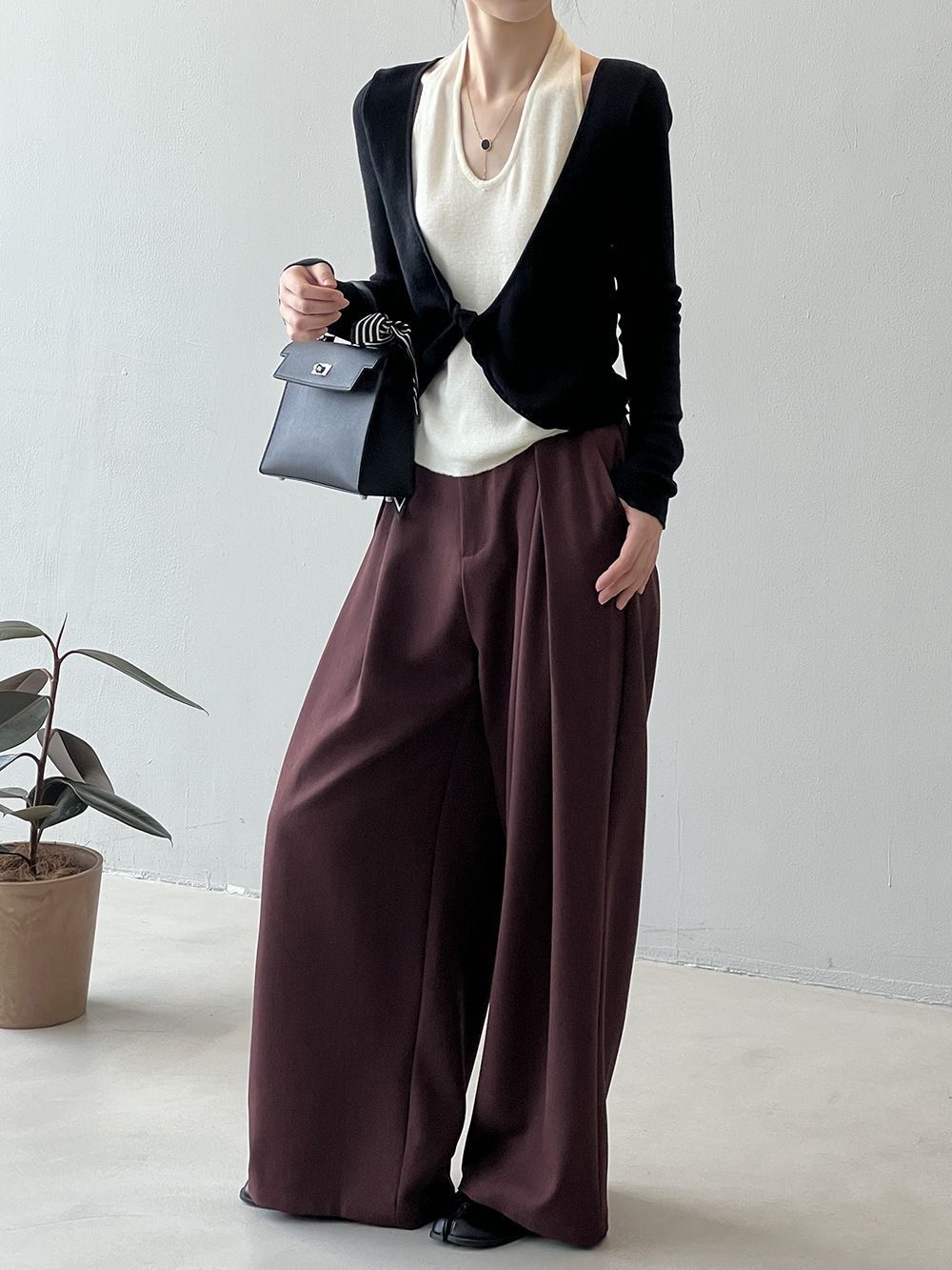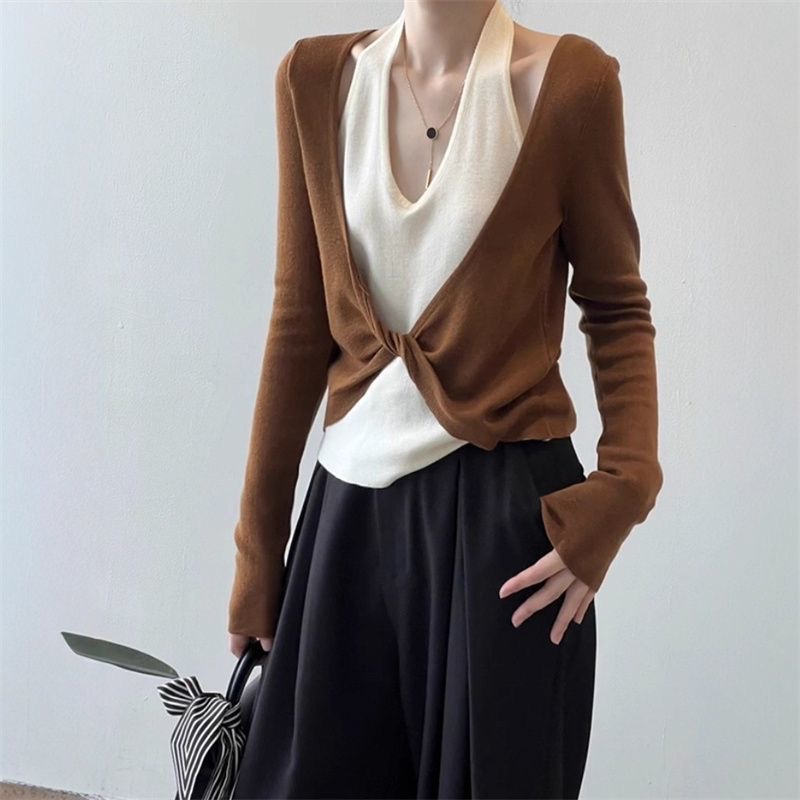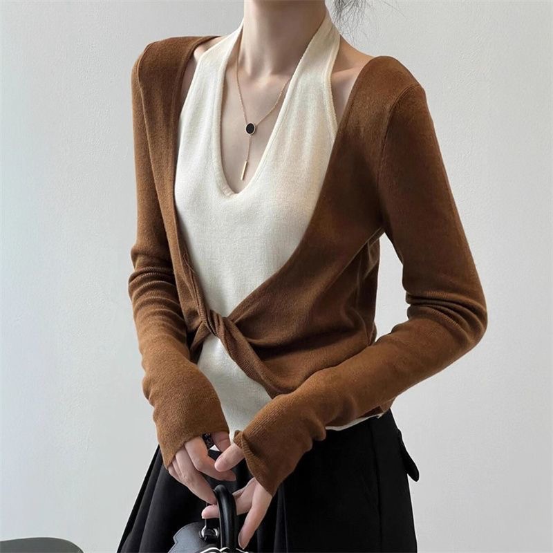 FA53114# 秋季新款流行独特别致设计轻奢显瘦百搭咖色V领假两件上衣ins 服裝批發女裝批發服飾貨源