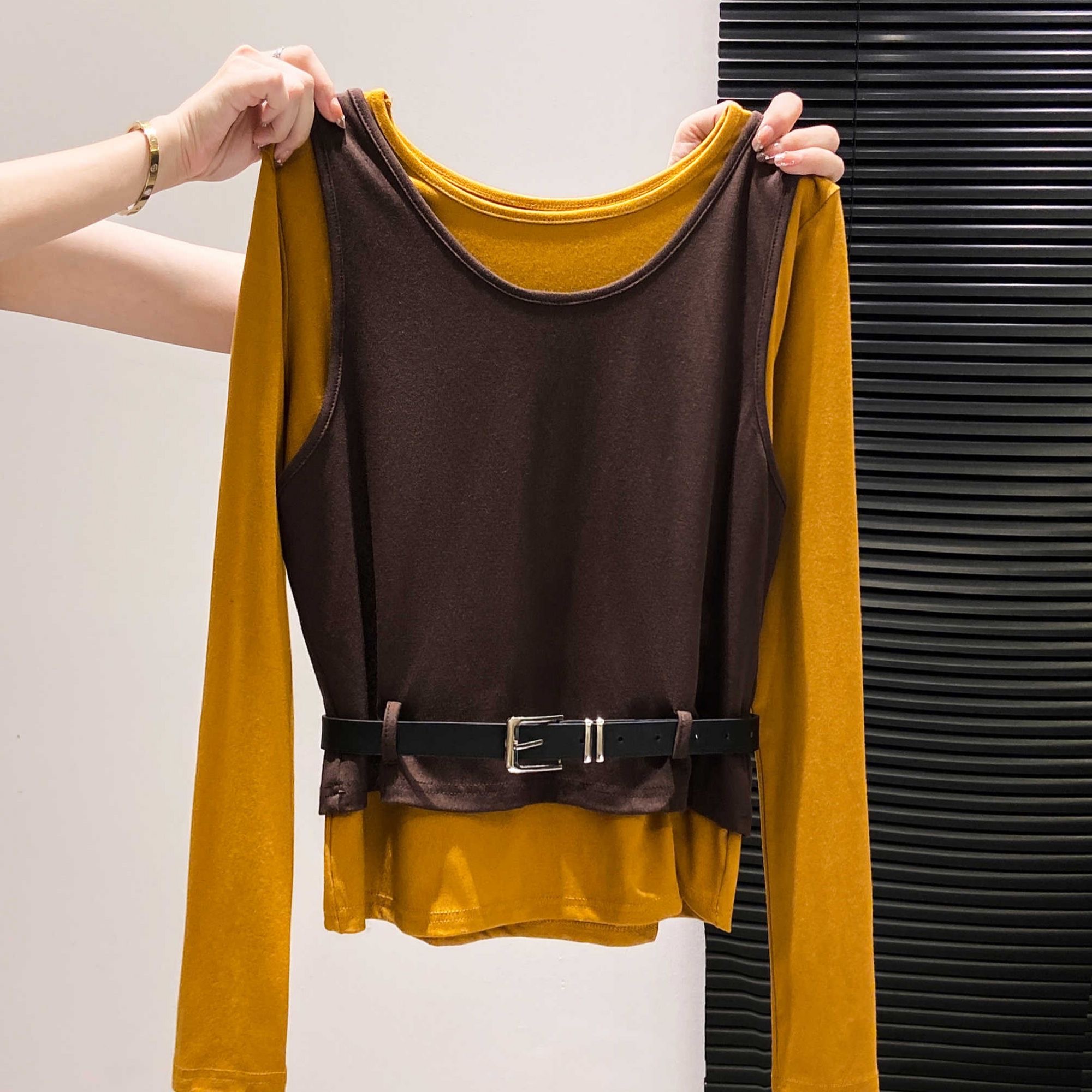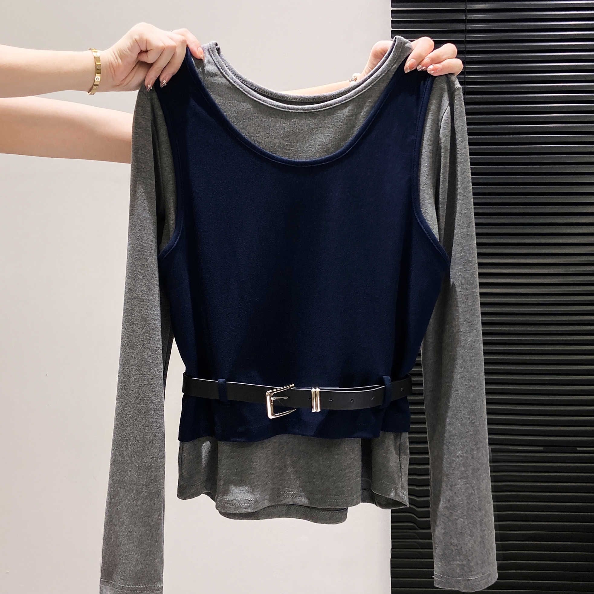 FA53115# 秋季新款纯棉长袖T恤背心两件套腰带显瘦设计百搭上衣件套 服裝批發女裝批發服飾貨源