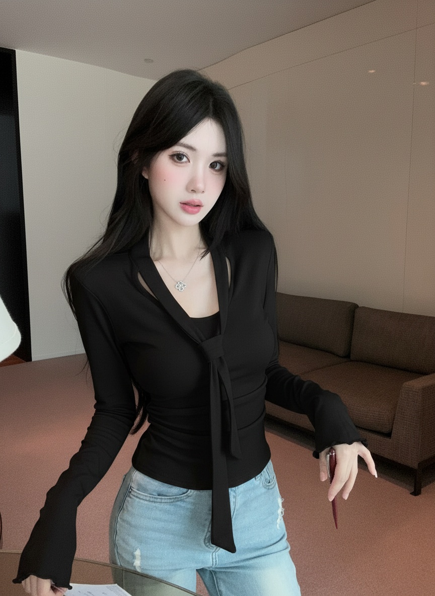 FA53196# 新款设计感收腰显瘦绝美圆领飘带长袖气质正肩上衣女 服裝批發女裝批發服飾貨源