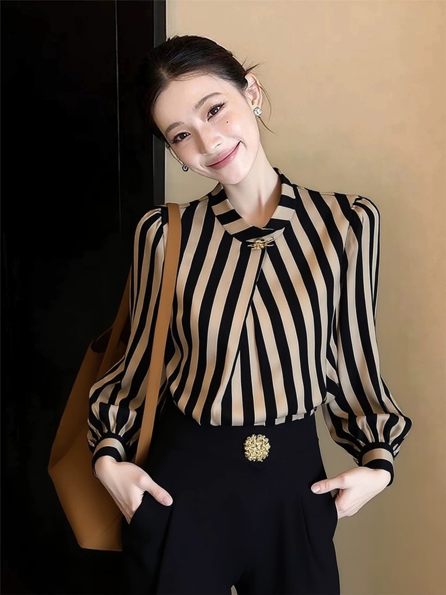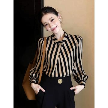 FA54071# 赫本风法式小众上衣女春季轻奢高端洋气减龄咖色条纹长袖衬衫 服裝批發女裝批發服飾貨源