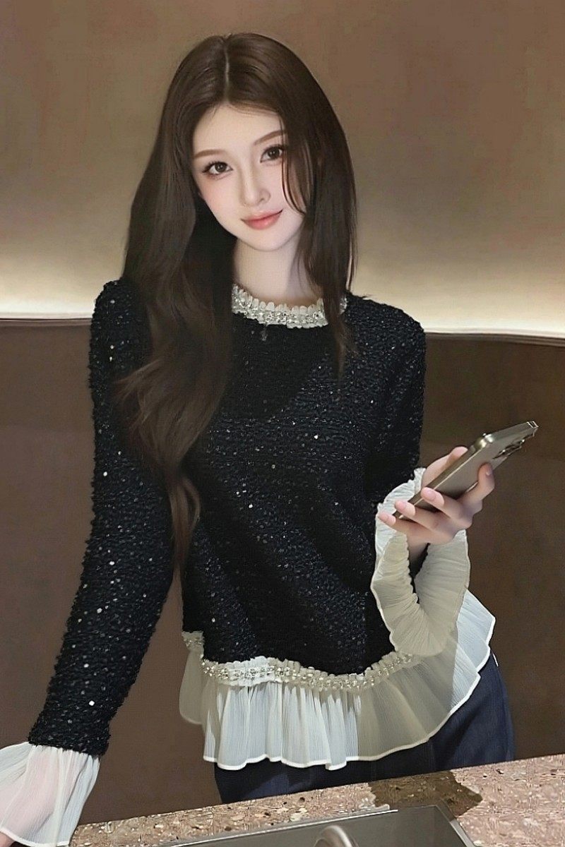 FA54075# 时尚洋气时髦设计感宴会叠穿上衣高级感黑色荷叶边亮片衬衫女冬季 服裝批發女裝批發服飾貨源