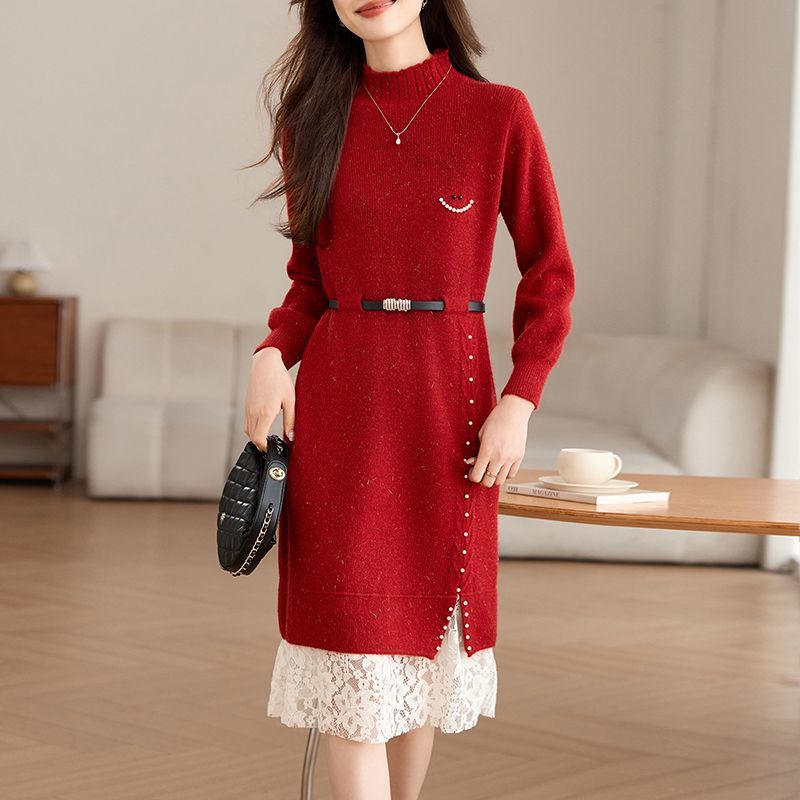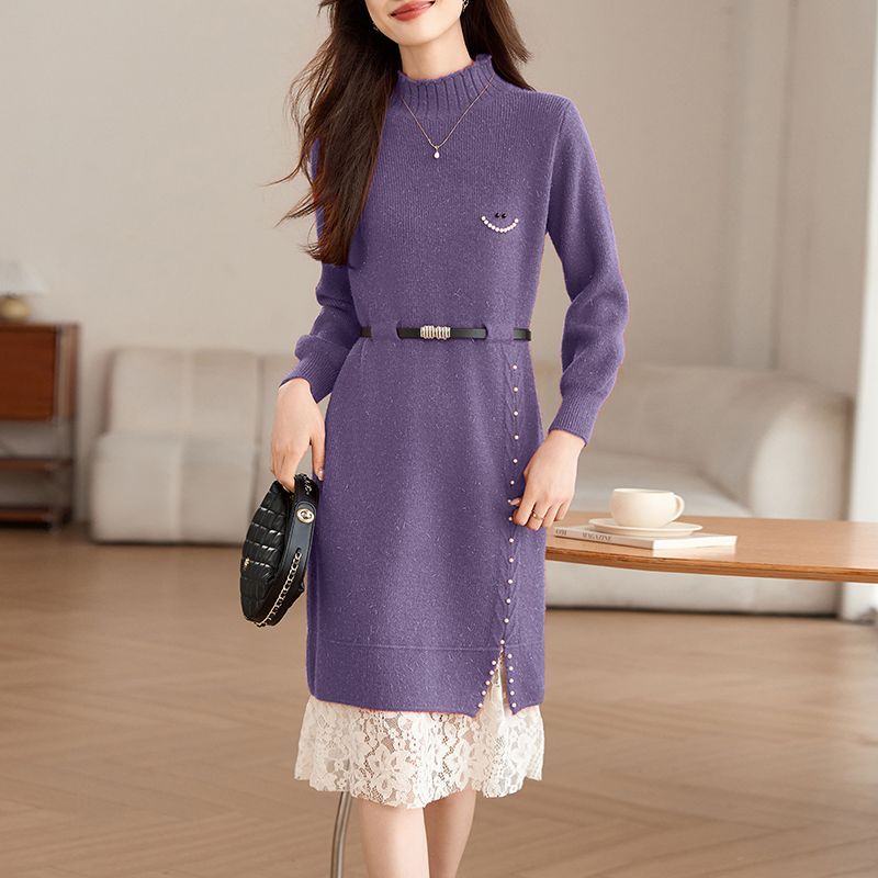 FA54690# 新款秋冬蕾丝网纱拼接针织连衣裙女洋气减龄遮肉显瘦连衣裙女 服裝批發女裝批發服飾貨源