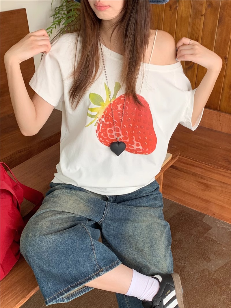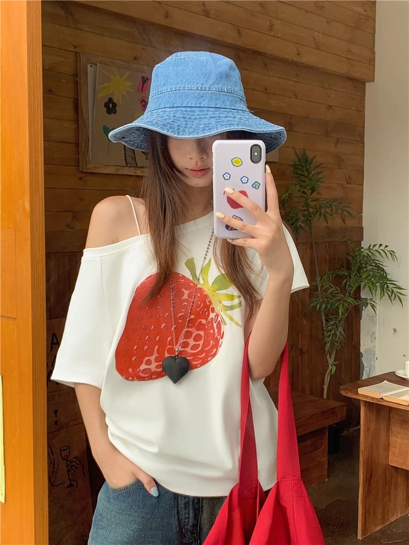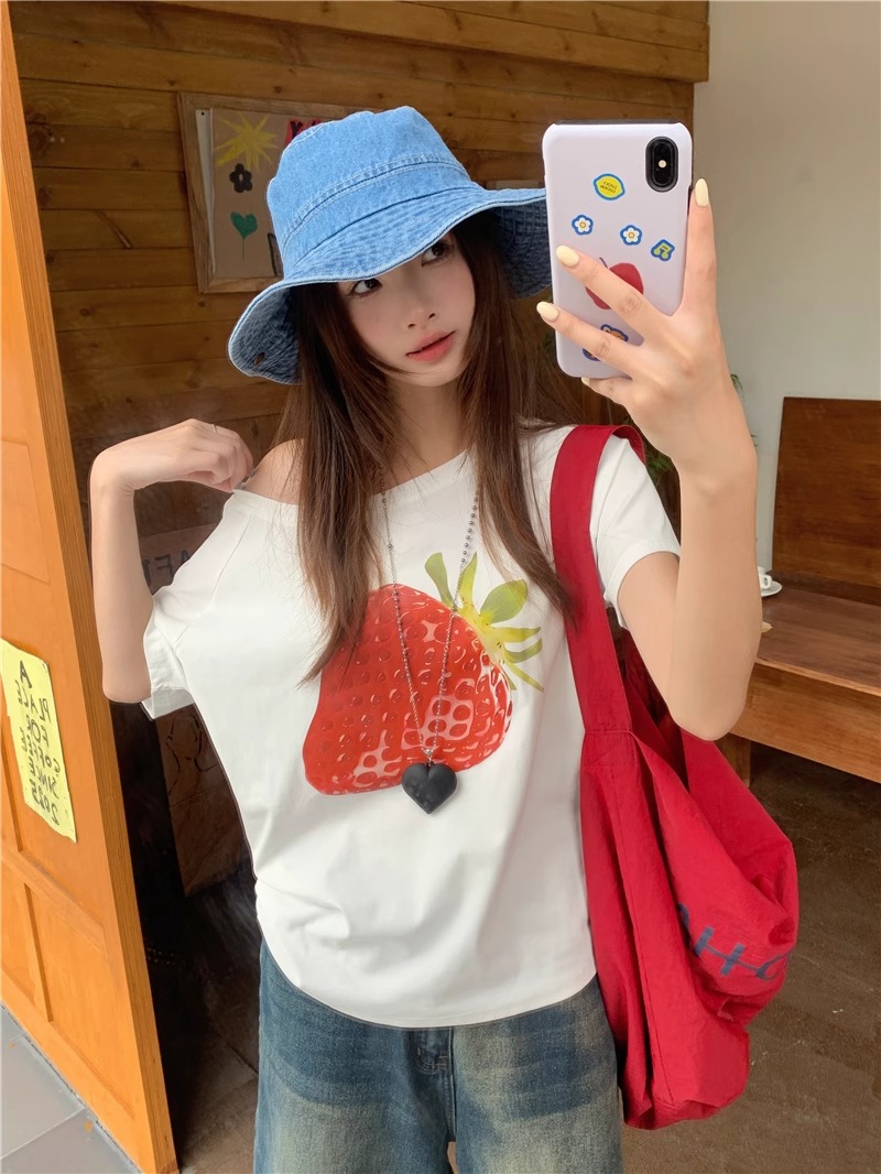 BY10107# 纯棉斜领一字肩露肩短袖T恤女印花 服裝批發女裝批發服飾貨源