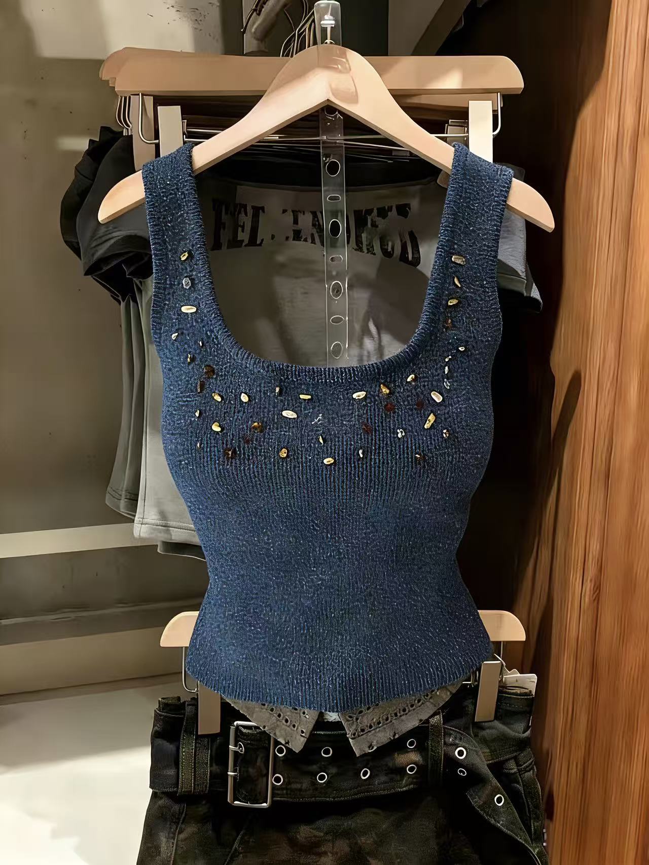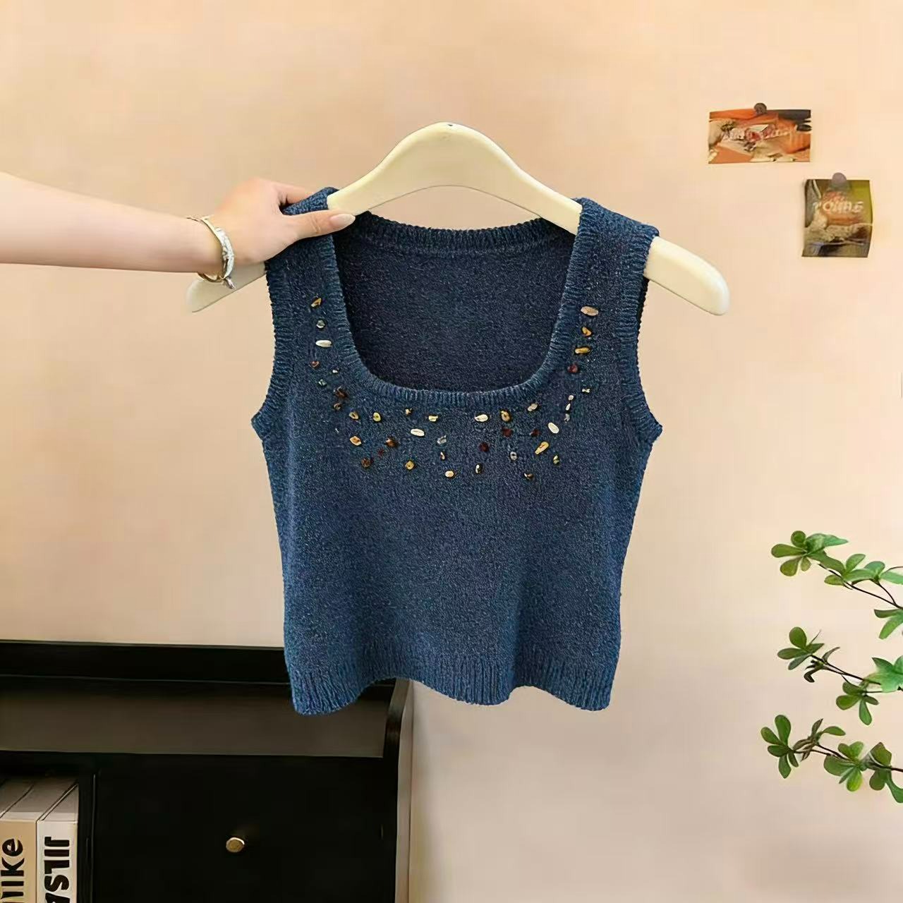 BY14853# 重工超糯背心中古手工钉珠雪尼尔女新款绝美百搭上衣chic 服裝批發女裝批發服飾貨源