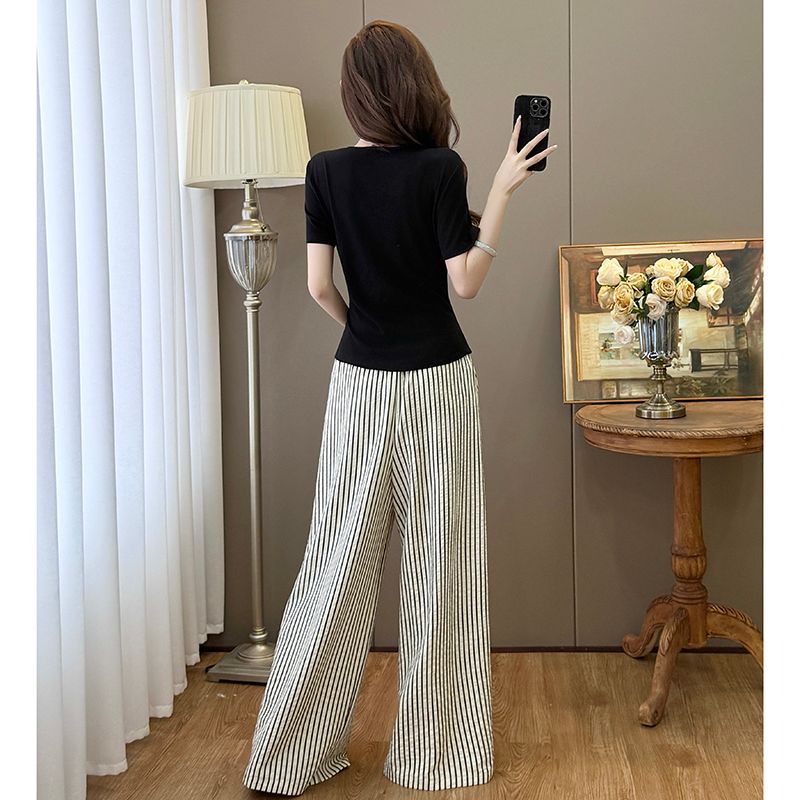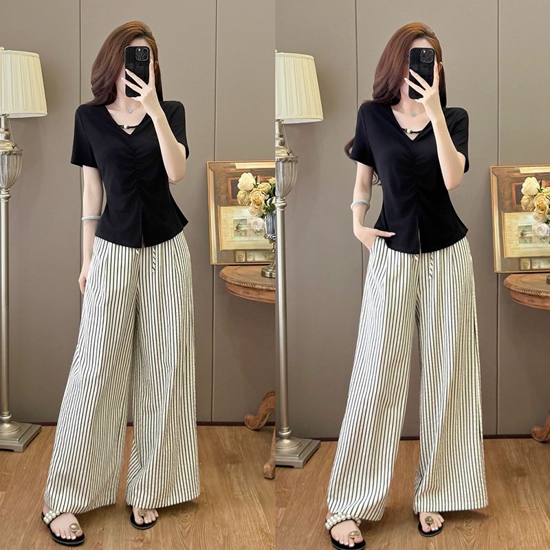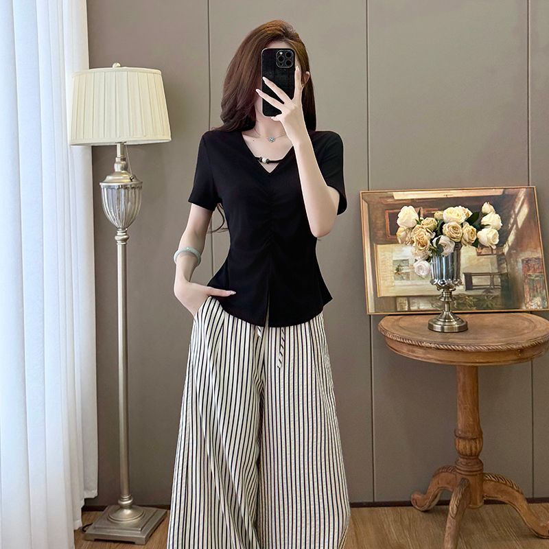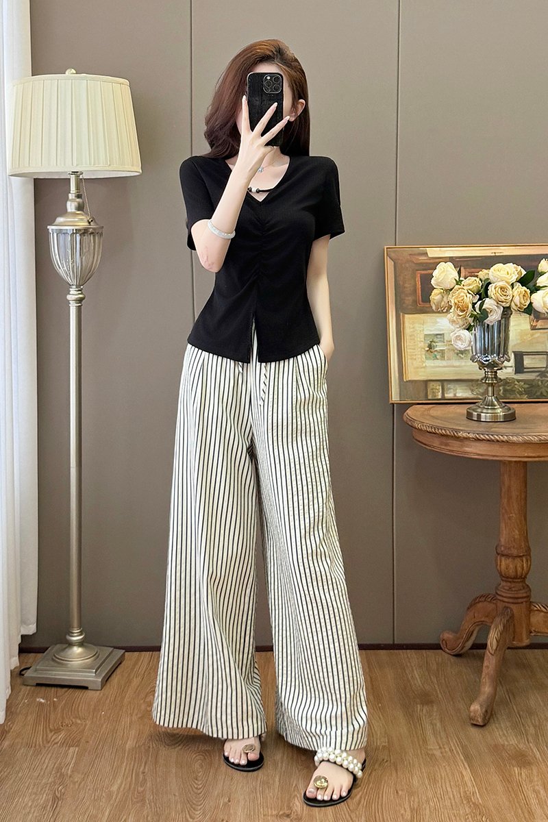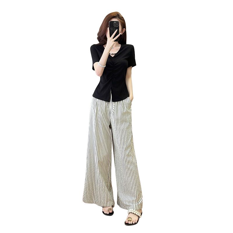 BY15901# 气质V领不规则短袖T恤上衣+高腰条纹垂感休闲阔腿裤套装 服裝批發女裝批發服飾貨源