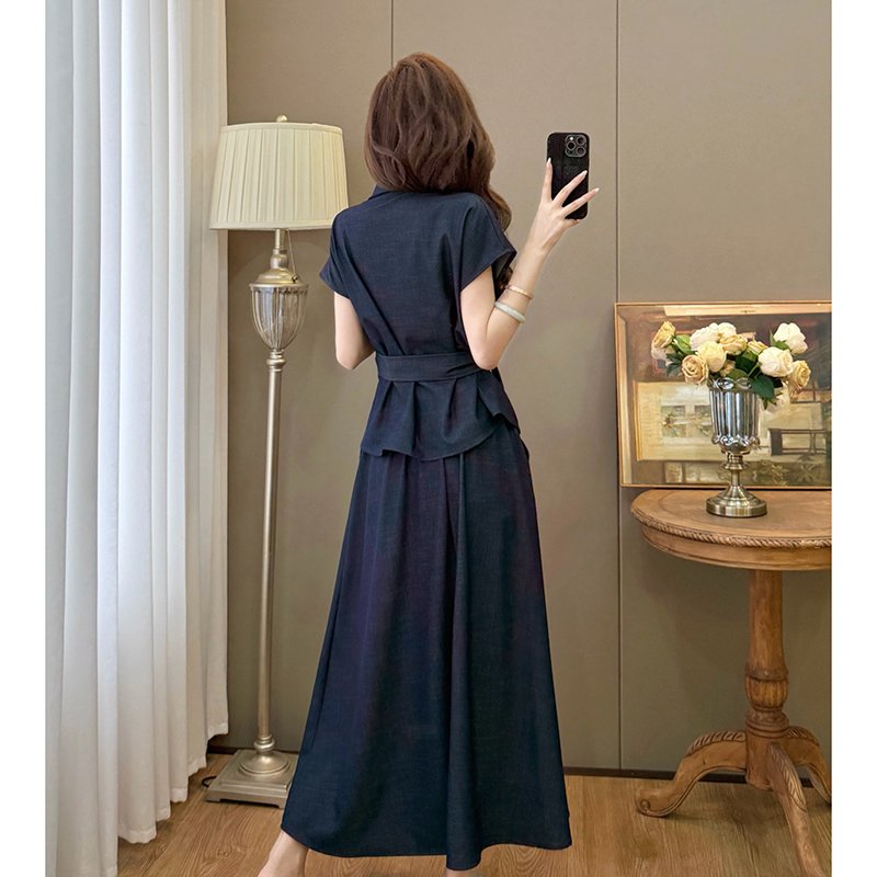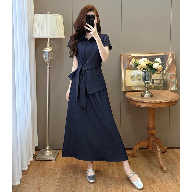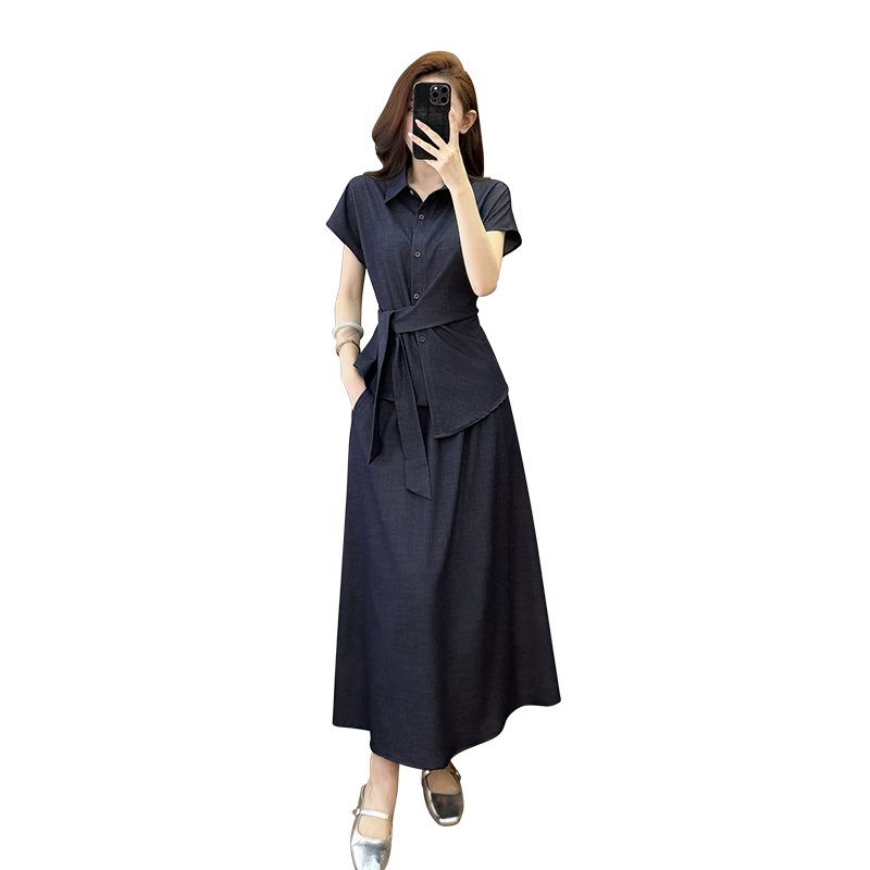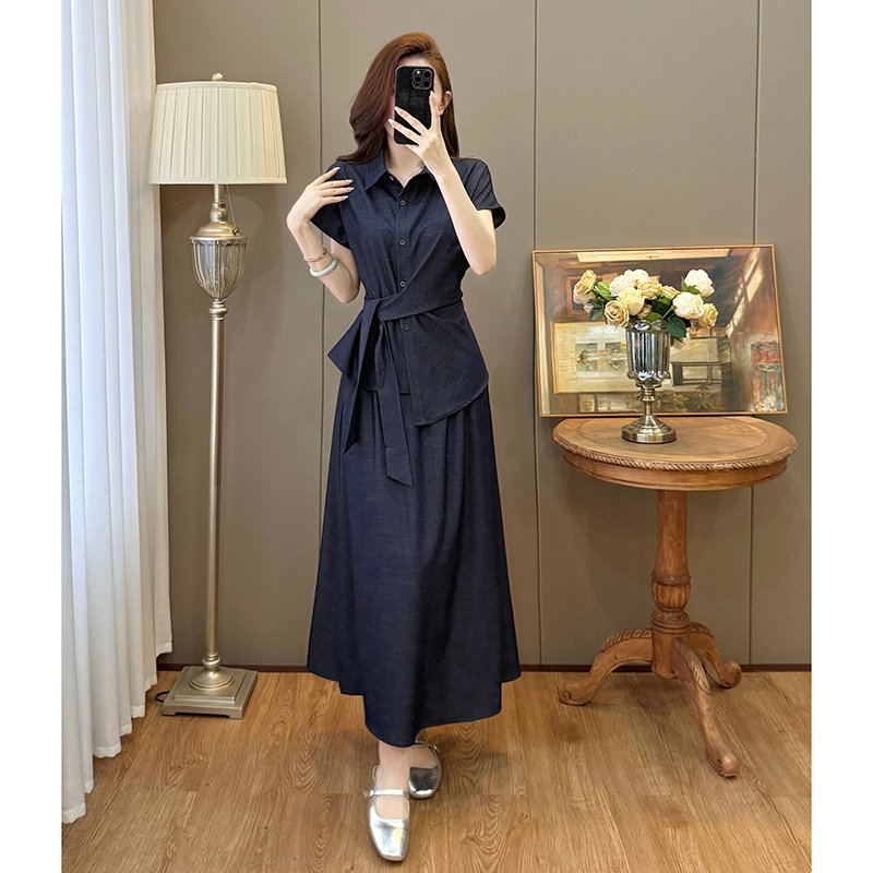 BY15905# 夏装新款大码女装收腰休闲衬衫仿牛仔显瘦半身裙通勤套装 服裝批發女裝批發服飾貨源
