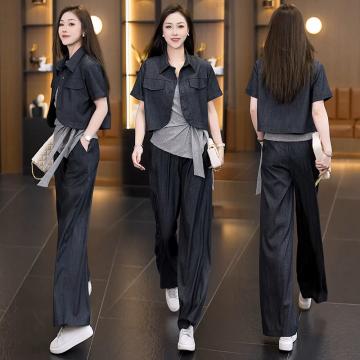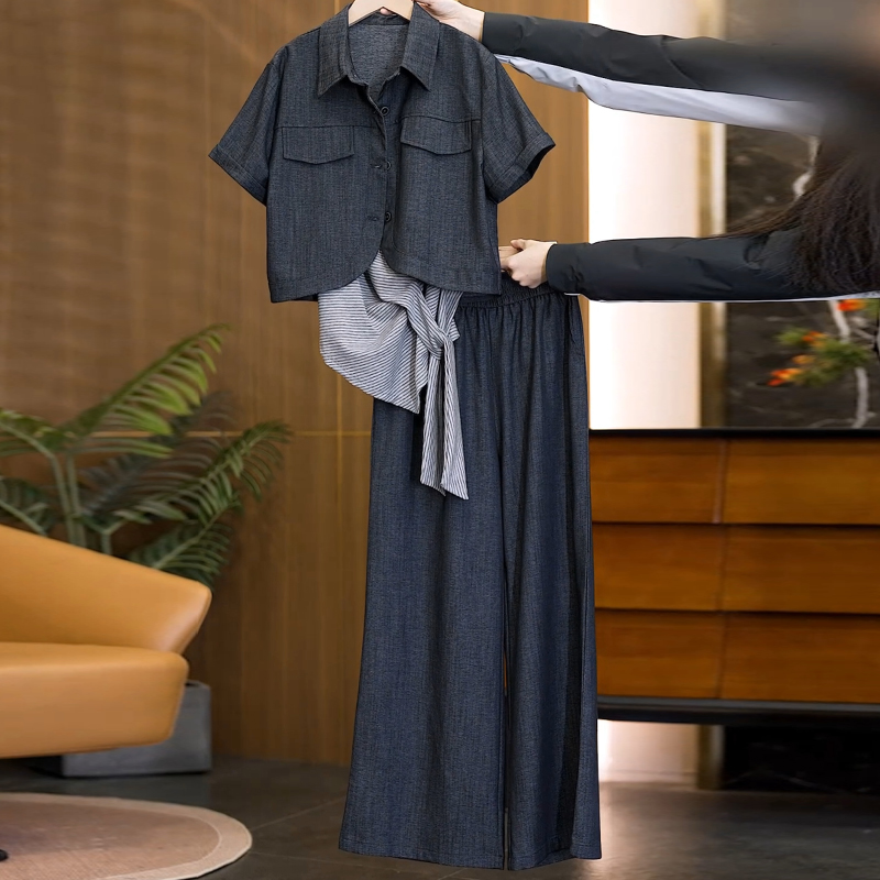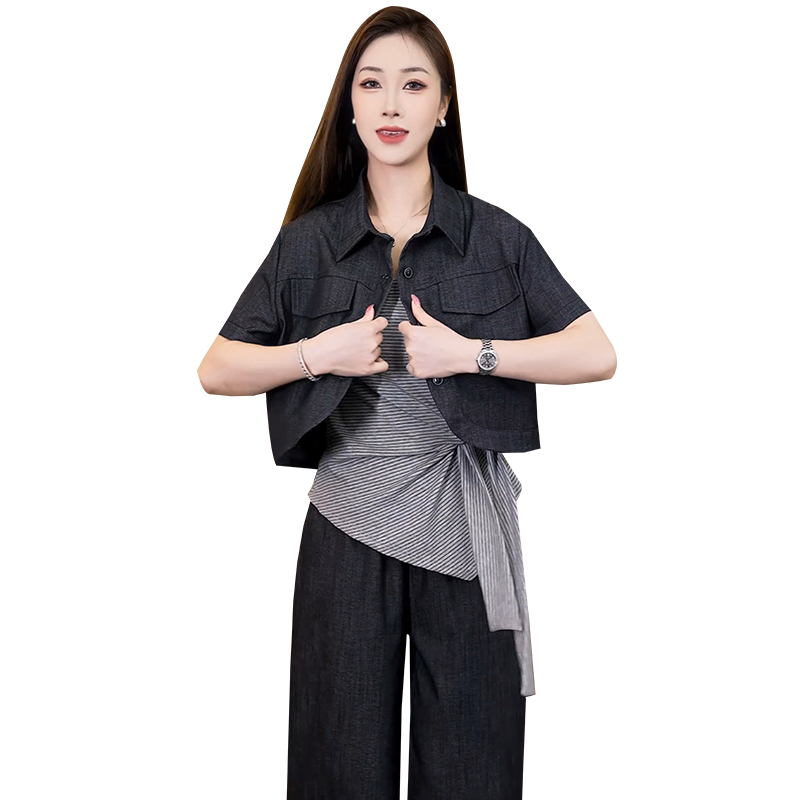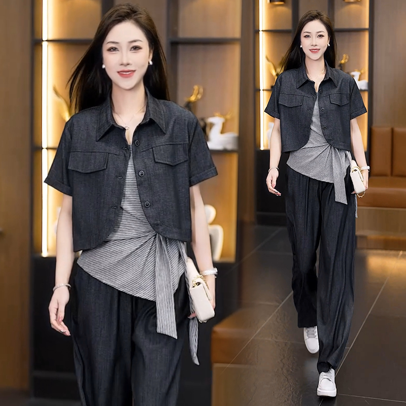 BY15906# 26夏新款大码女仿牛仔外套条纹吊带上衣显瘦直筒阔腿裤三套装 服裝批發女裝批發服飾貨源