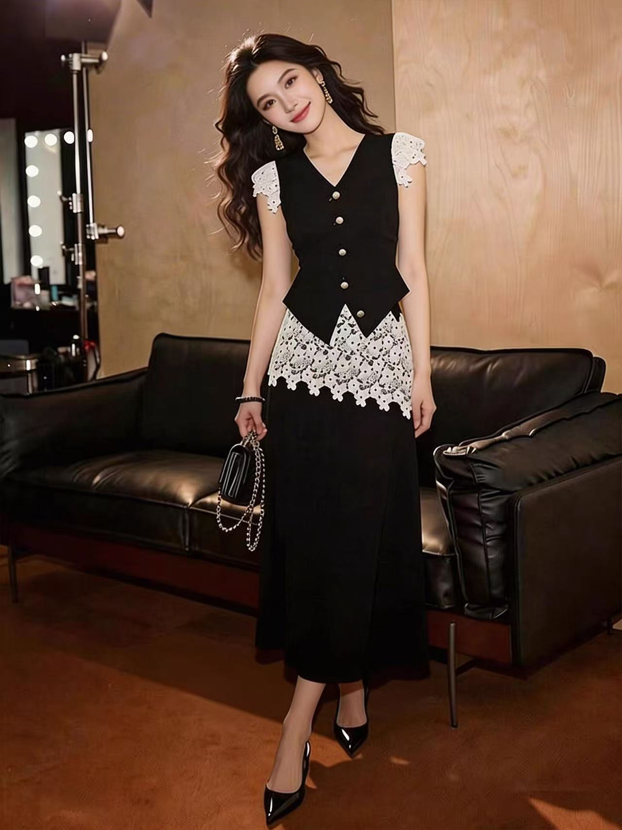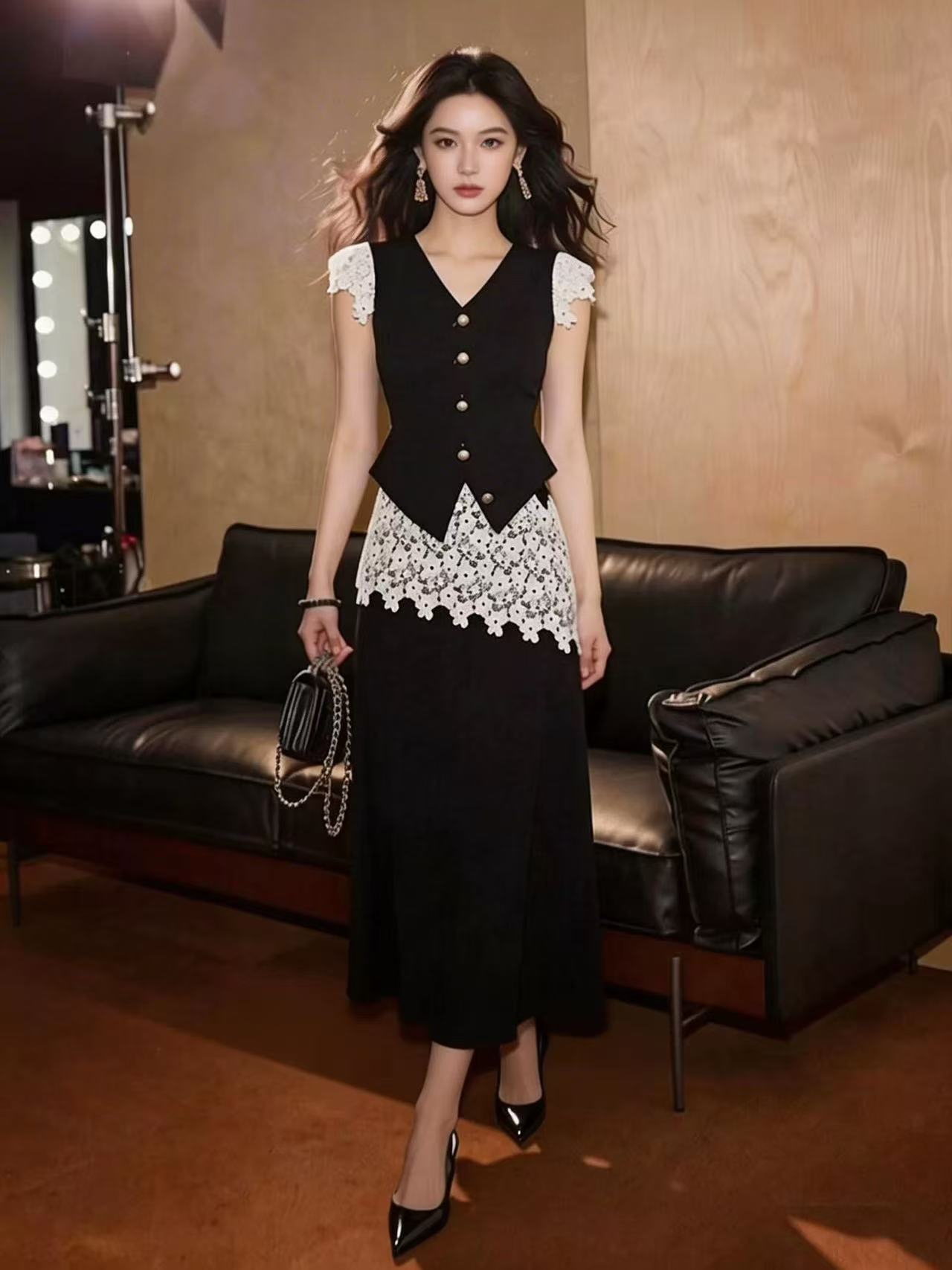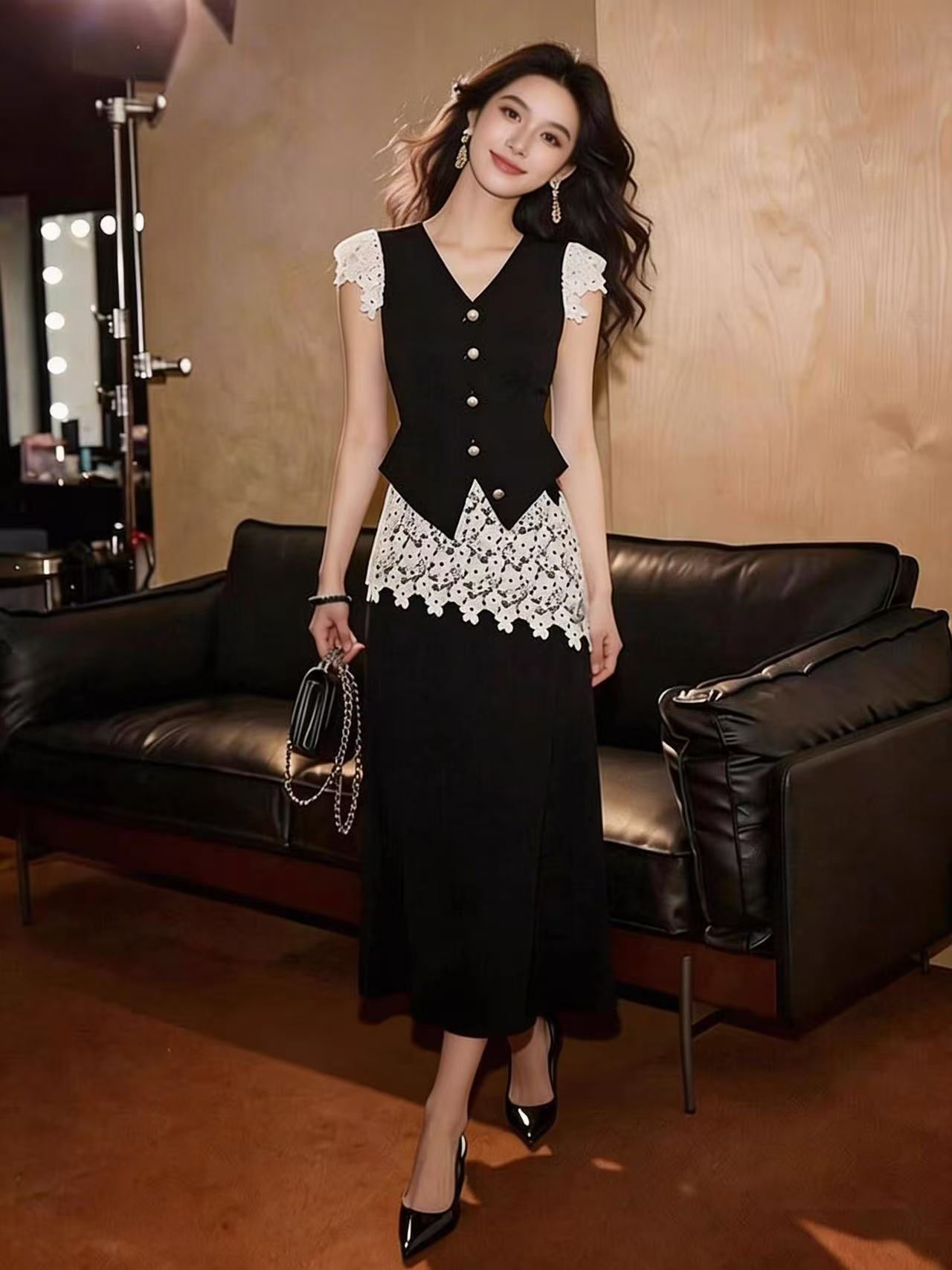 BY16314# 高级感气质黑色马甲半身裙套装女夏季新款显瘦休闲百搭两件套 服裝批發女裝批發服飾貨源