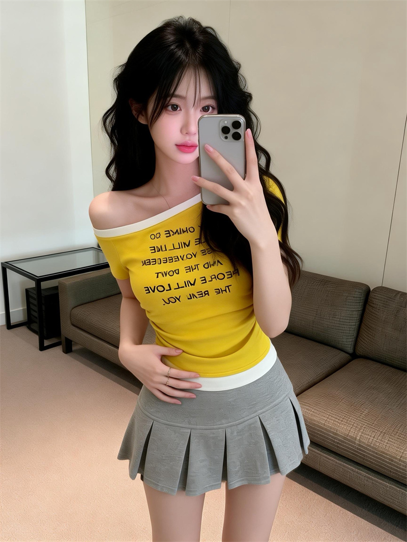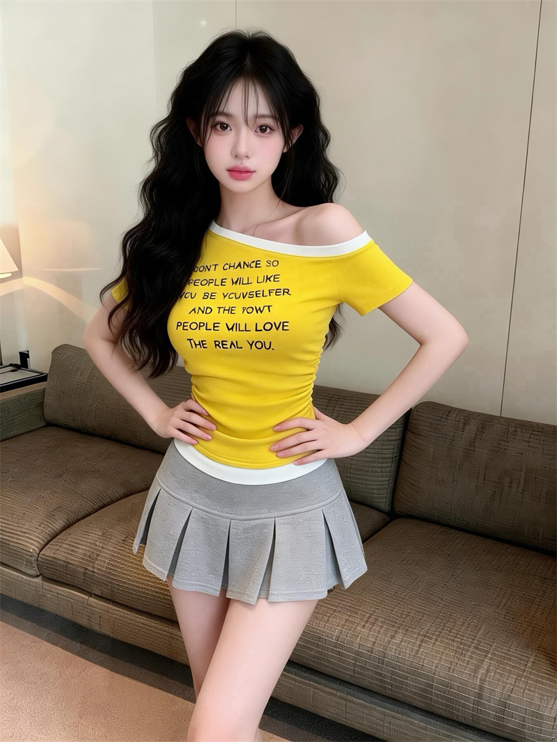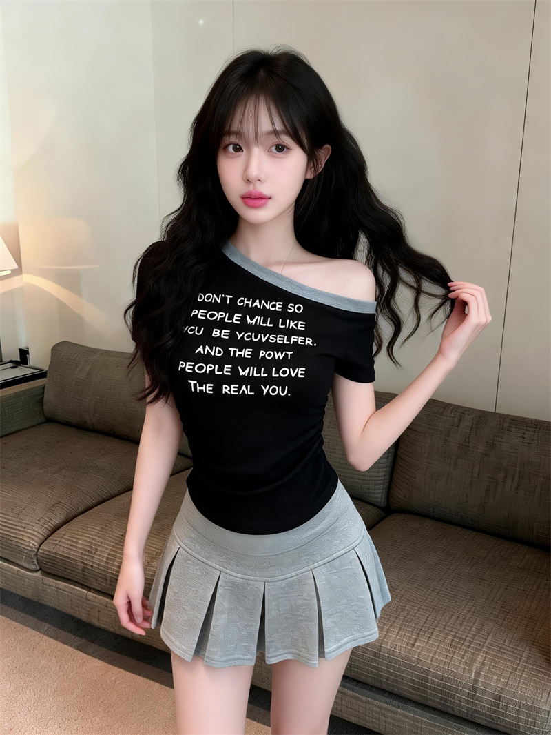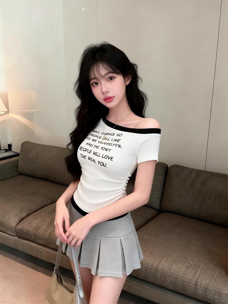 BY16409# 夏上新减龄收腰设计斜肩撞色印花短袖T恤女修身上衣 服裝批發女裝批發服飾貨源