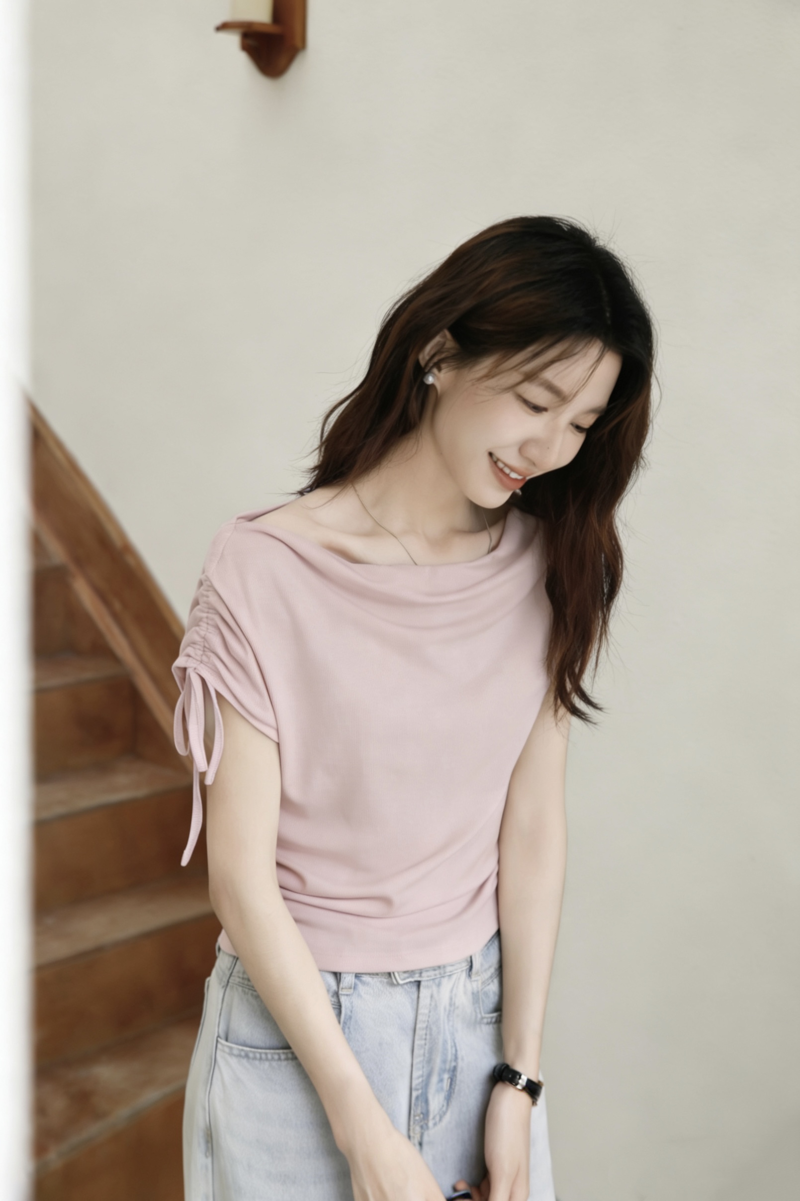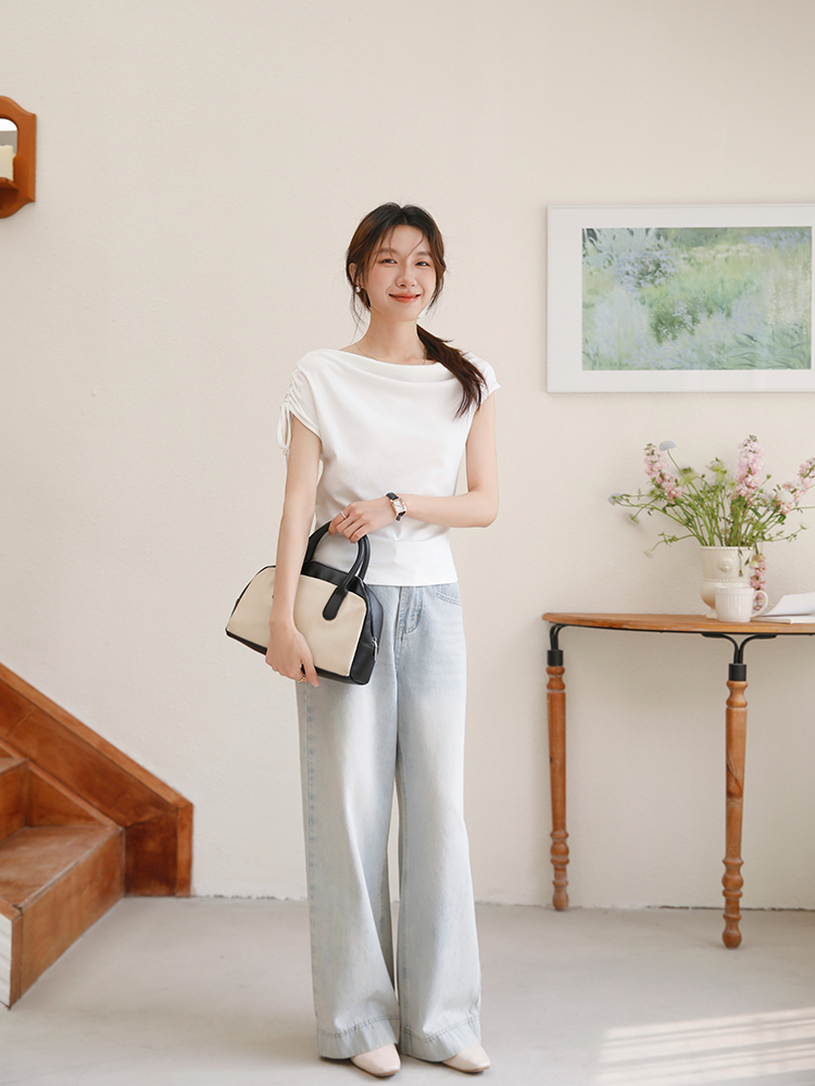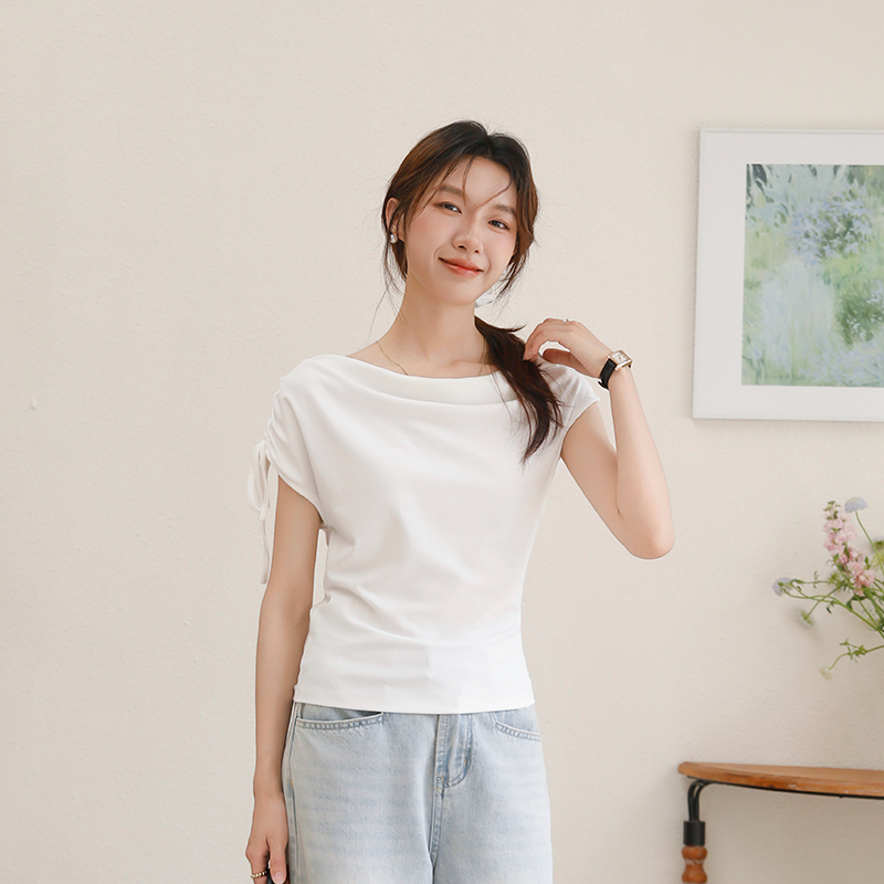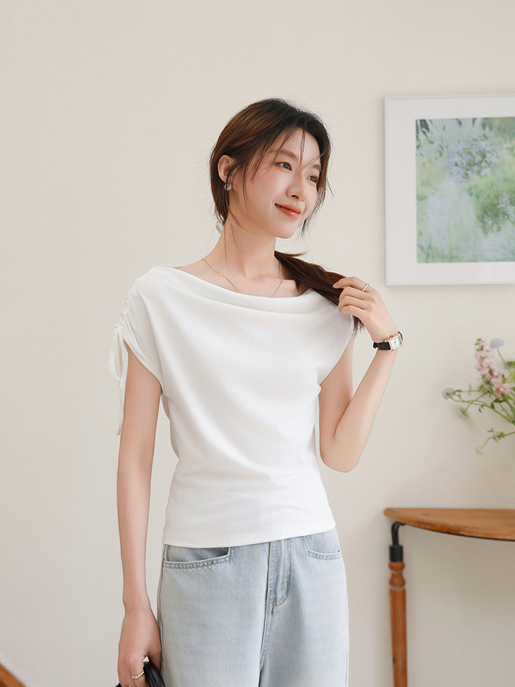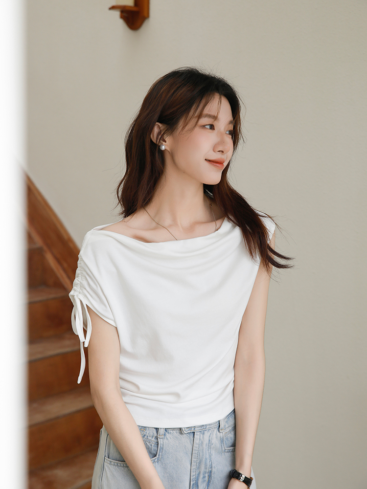 BY16438# 夏季荡领绑带斜肩短袖T恤修身显瘦设计感褶皱上衣 服裝批發女裝批發服飾貨源