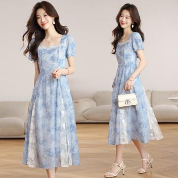 风传花信法式气质蓝色花朵短袖方领连衣裙女夏收腰长裙 服裝批發女裝批發服飾貨源