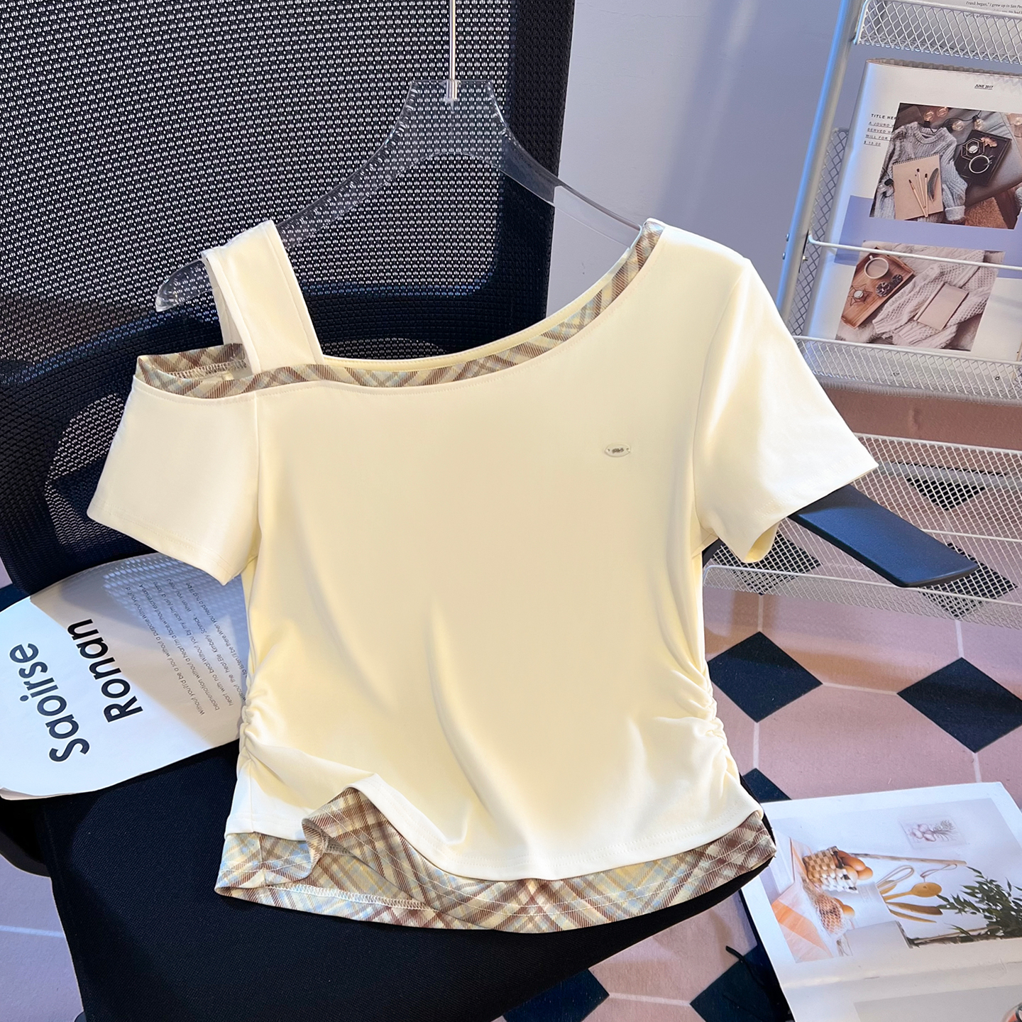 BY16513# 新款甜美斜肩温柔风短袖T恤格子拼色网红显瘦上衣 服裝批發女裝批發服飾貨源