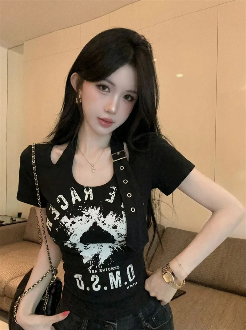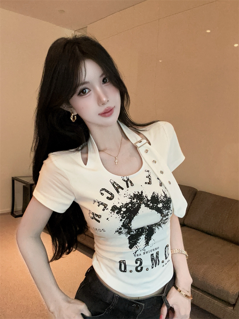 BY16515# 夏季新款挂脖卡扣设计感字母印花T恤百搭时尚打底衫 服裝批發女裝批發服飾貨源