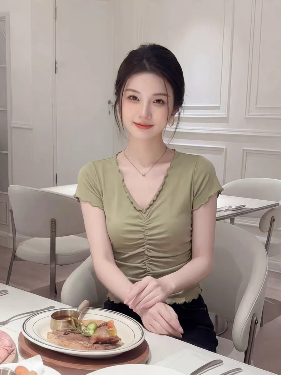 BY16563# 轻熟辣妹风橄榄绿褶皱T恤夏季新款收腰抽褶设计感气质上衣 服裝批發女裝批發服飾貨源