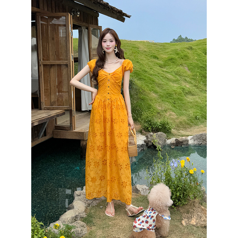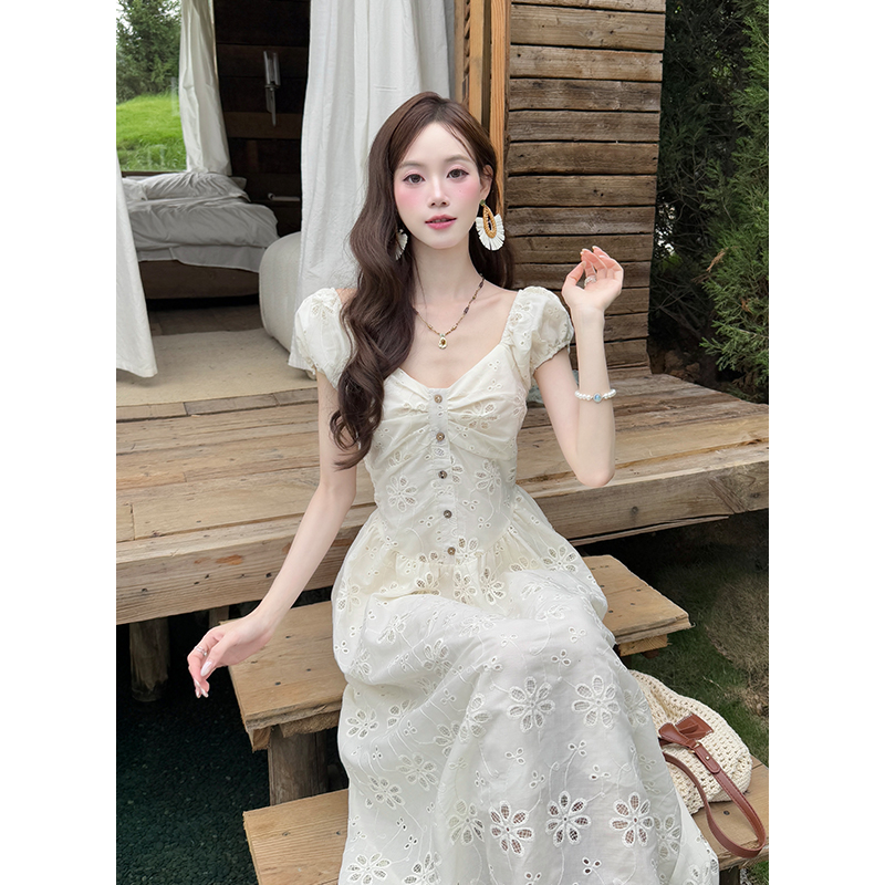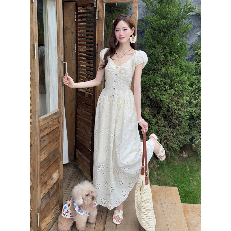 夏季新款法式优雅V领刺绣镂空裙子短袖连衣裙女 服裝批發女裝批發服飾貨源