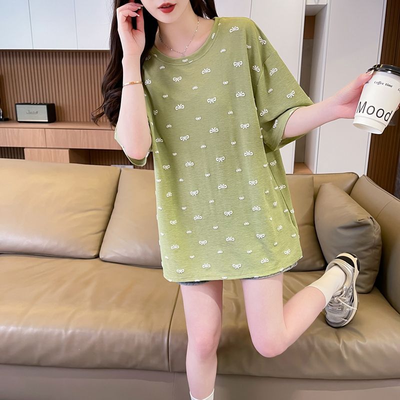 BY16585# 人棉竹节后包领中长款蝴蝶印花短袖T恤 服裝批發女裝批發服飾貨源