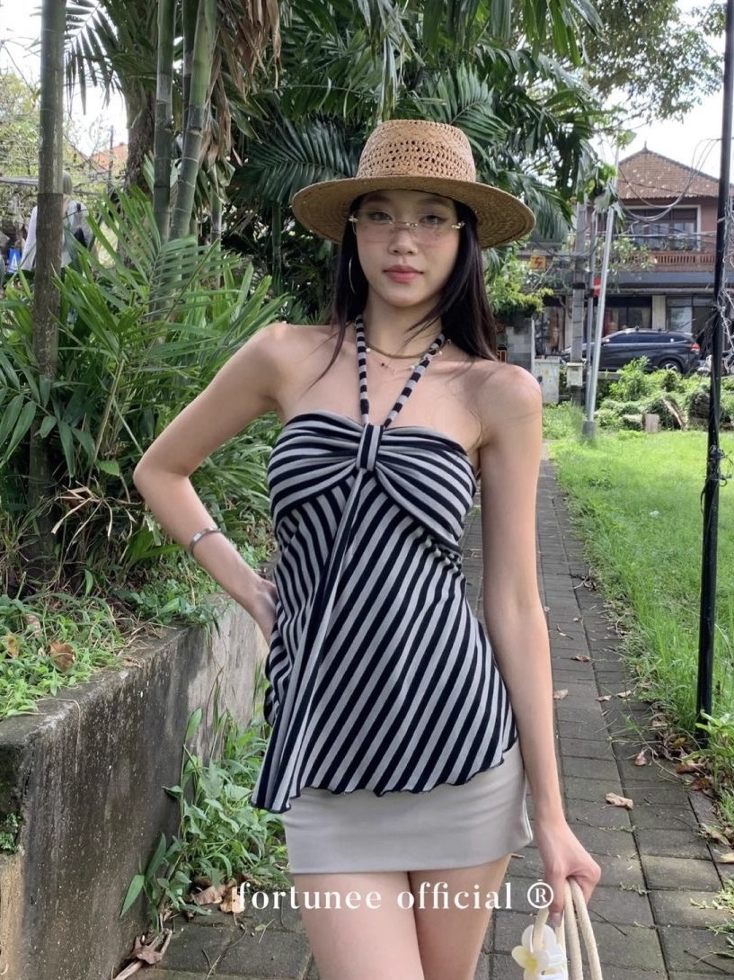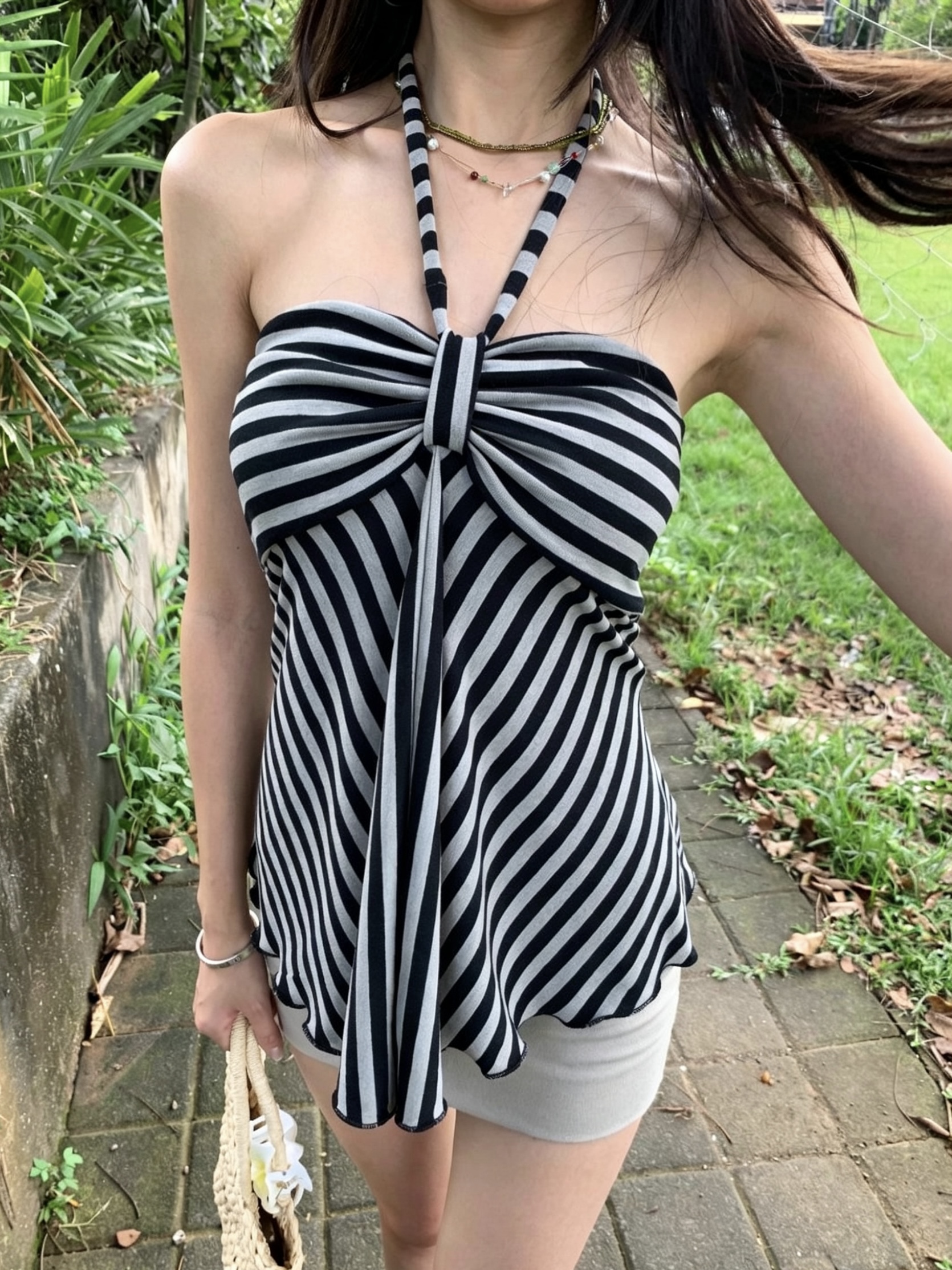 BY16645# 条纹挂脖抹胸背心女夏季新款洋气百搭显瘦无袖露背辣妹时尚上衣潮
