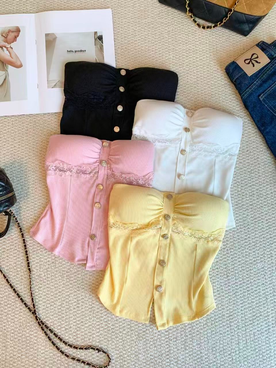 BY16792# 夏季新款性感纯欲风抹胸背心女小众独特设计感蕾丝拼接短款上衣
